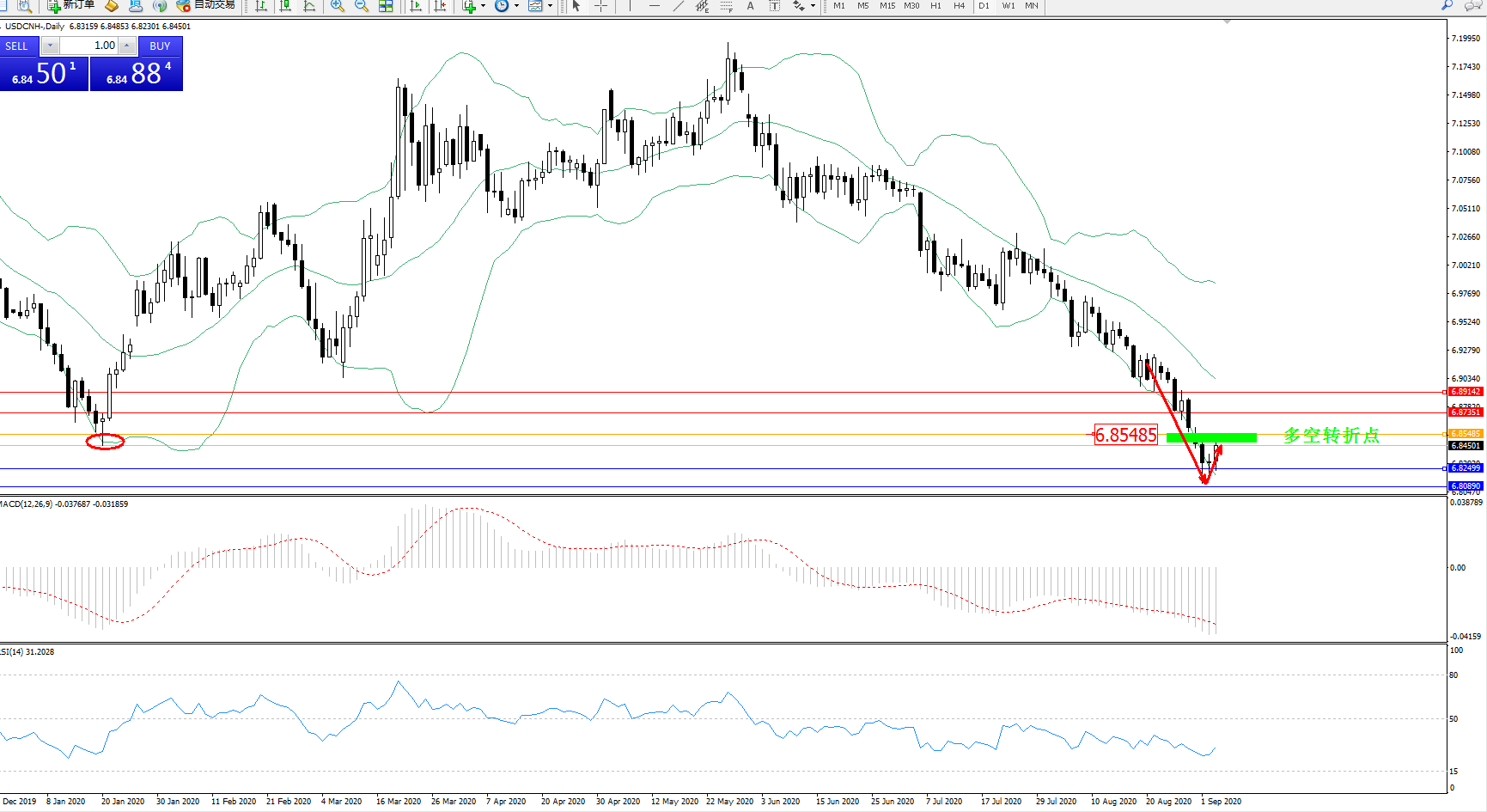 交易策略:6.85485下方看跌,目标6.82499、6.80890