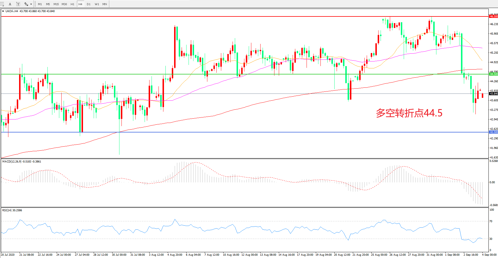 交易策略:   在44.50之下看跌,目标42.50       40.00