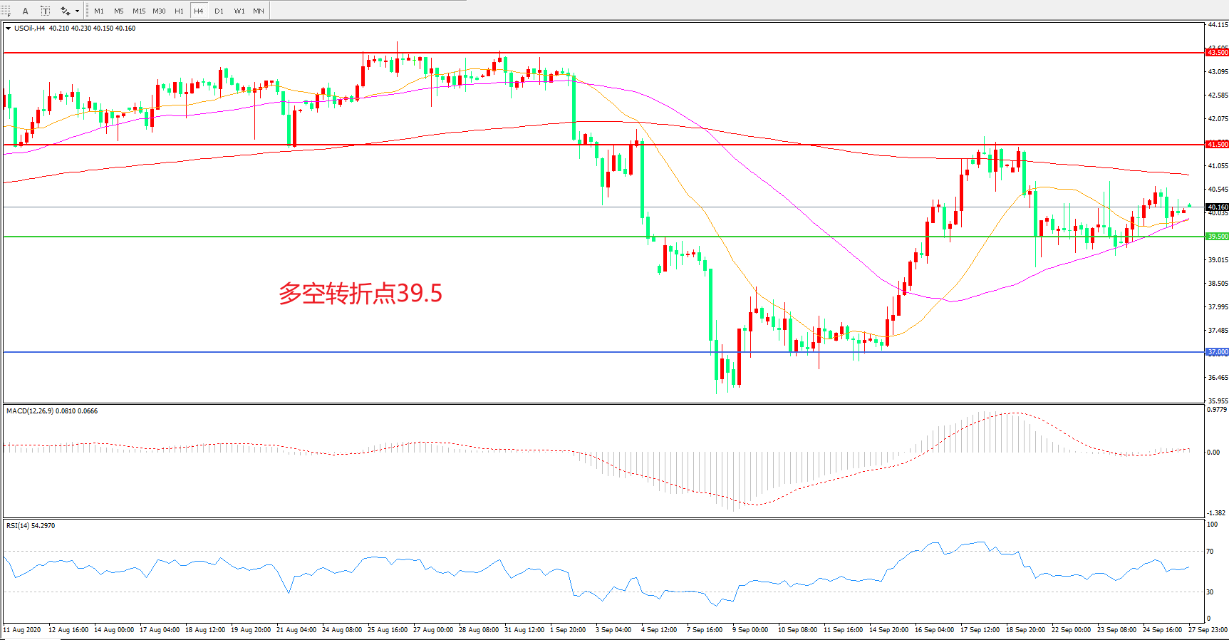4小时图看,油价以39.5美元为依托震荡反弹,短期走势有所回暖,均线系统走平,MACD红柱增加,RSI指标走平,日内延续震荡概率较大。