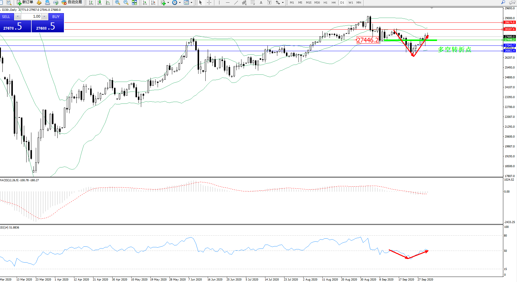 道琼斯指数10月1日(周四)收盘上涨35.20点,涨幅0.13%,报27816.90点。美股三大指数全线收涨,大型科技股领涨,市场正在权衡民主党议员与白宫就新一轮刺激方案达成协议的可能性。围绕财政刺激方案谈判的消息导致市场走势震荡。目前尚未达成协议,官员们仍在寻求取得突破,周四谈判还将继续进行。投资者正关注美国众议院议长佩洛希和财政部长努钦就期待已久的新冠援助议案达成协议的磋商。周四公布的美国经济数据对汇率的影响微乎其微。如果说有什么不同的话,那就是他们肯定了美国经济复苏仅是暂时性的特性。数据显示,美国上周初请失业金人数下降,但仍维持在经济衰退的水平,8月个人所得下降。美国8月建筑支出增幅高于预期,因利率处于历史低位提振房屋建筑,但9月制造业活动意外放缓。