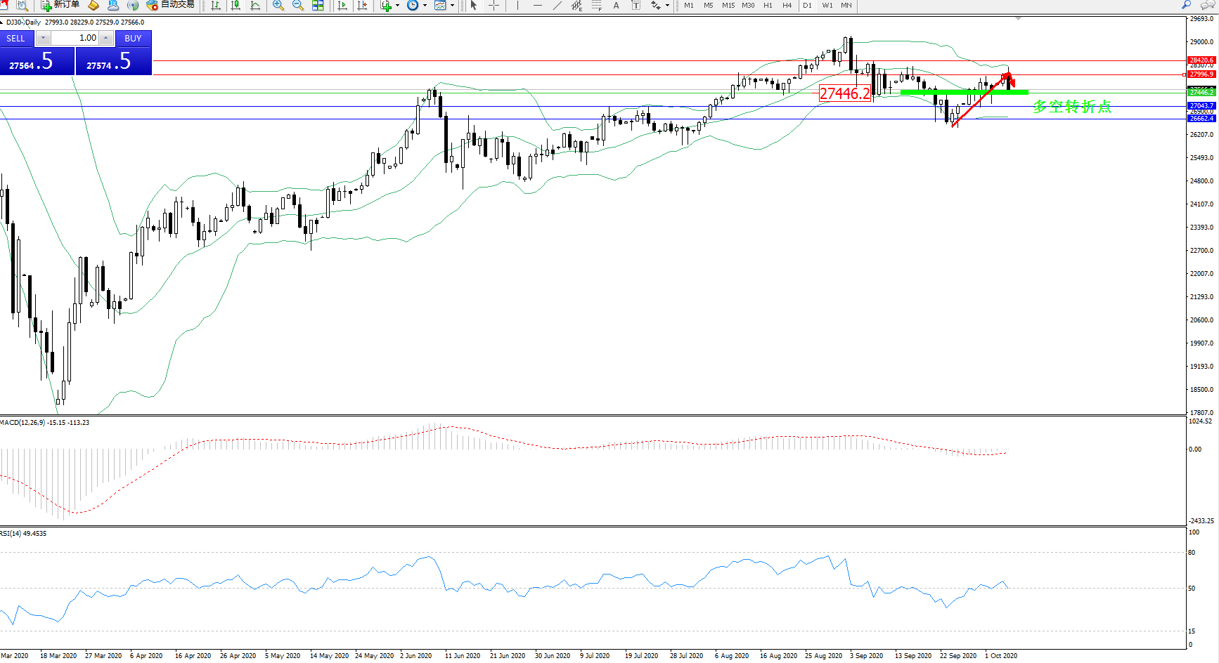 道琼斯指数10月6日(周二)收盘下跌375.90点,跌幅1.34%,报27772.76点。美股三大指数均跌超1%,美国总统特朗普周二叫停了与民主党议员的新冠救助议案谈判,直到大选结束。对于已经开始满怀希望等待新一轮刺激措施推出的市场而言,这个消息无疑是出人意料的。除非有新一轮财政刺激,否则经济很难获得太大动力。尽管在流感季节到来之前,美国大部分地区的新冠病毒病例都在上升,美国众议院议长佩洛西表示,特朗普决定停止谈判表明白宫“混乱不堪”。若冠状病毒不能得到有效控制,经济无法持续增长的话,美国经济距离完成复苏将会很遥远,且经济仍有可能陷入下行螺旋。鲍威尔呼吁向企业和家庭提供更多帮助。民主党总统候选人拜登在民调中的领先优势不断扩大,被视为给美元造成拖累。出现民主党掌控白宫和国会的可能性增加,这会为急需的财政刺激打开大门,对风险资产来说是可喜的进展,并可能削弱美元。