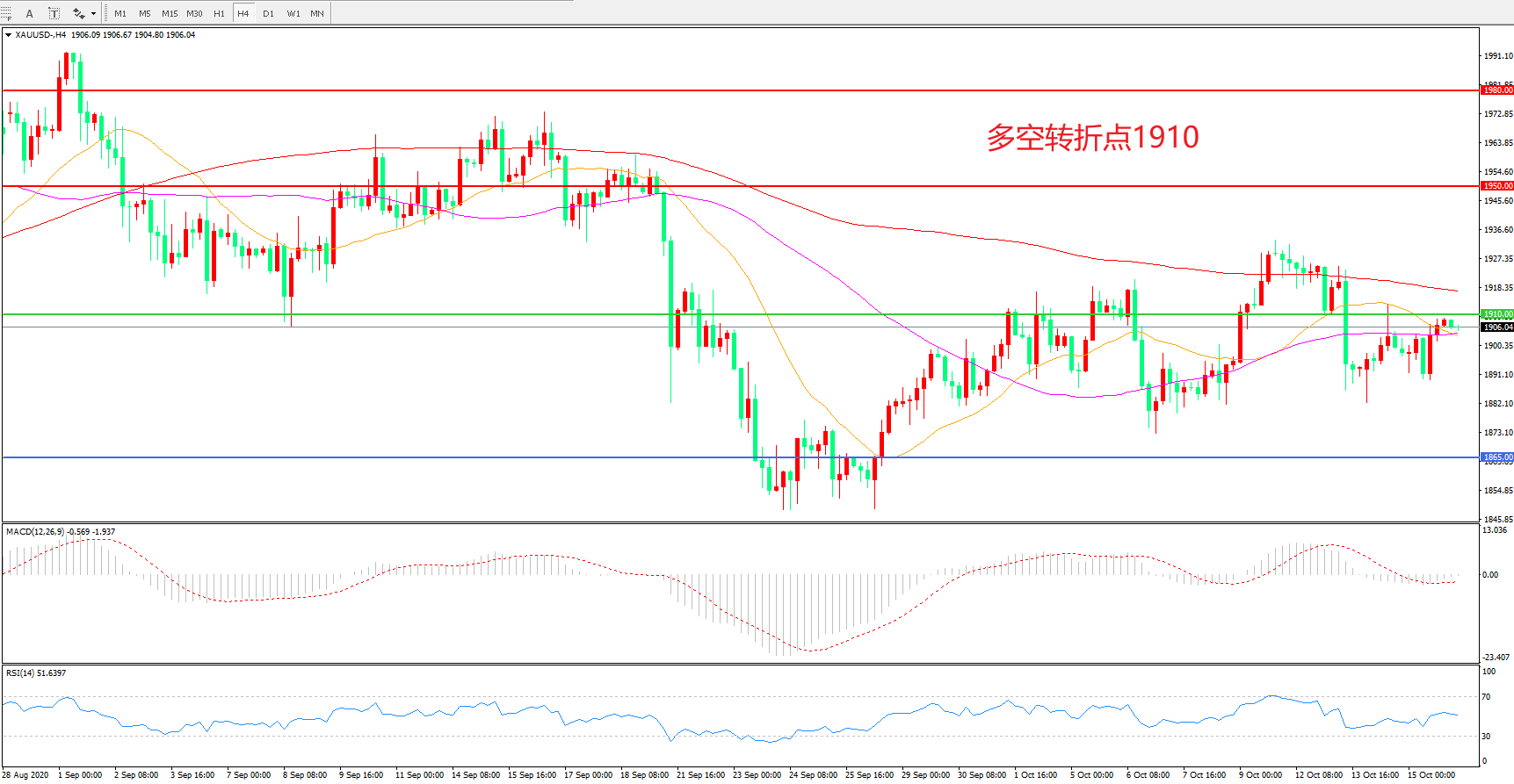 4小时图看,金价延续低位震荡,1910成为短期多空分水岭,均线系统走平,MACD红柱增加,RSI指标走平,日内延续震荡概率较大。