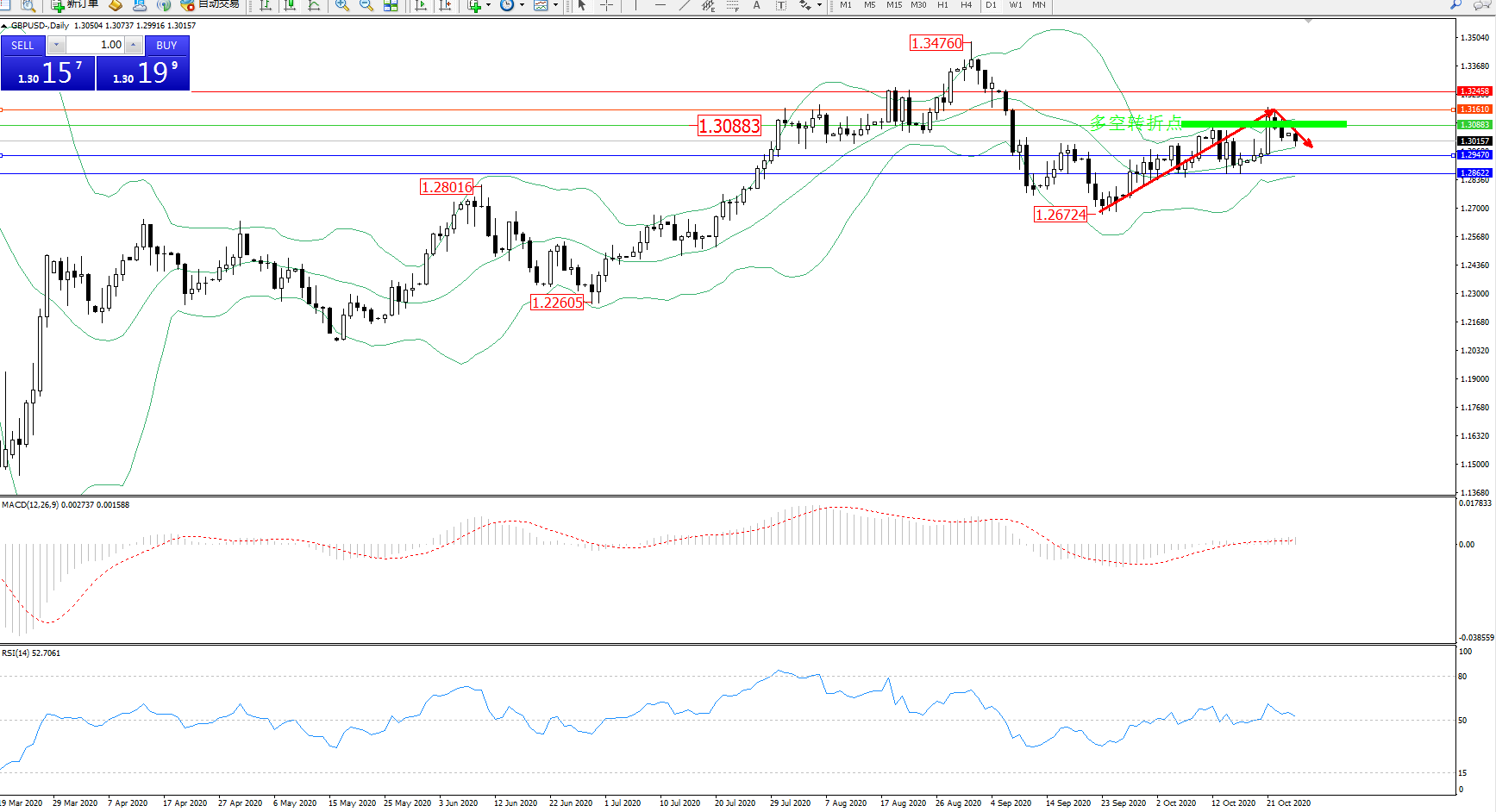 交易策略:1.30883下方看跌,目标1.29470、1.28622