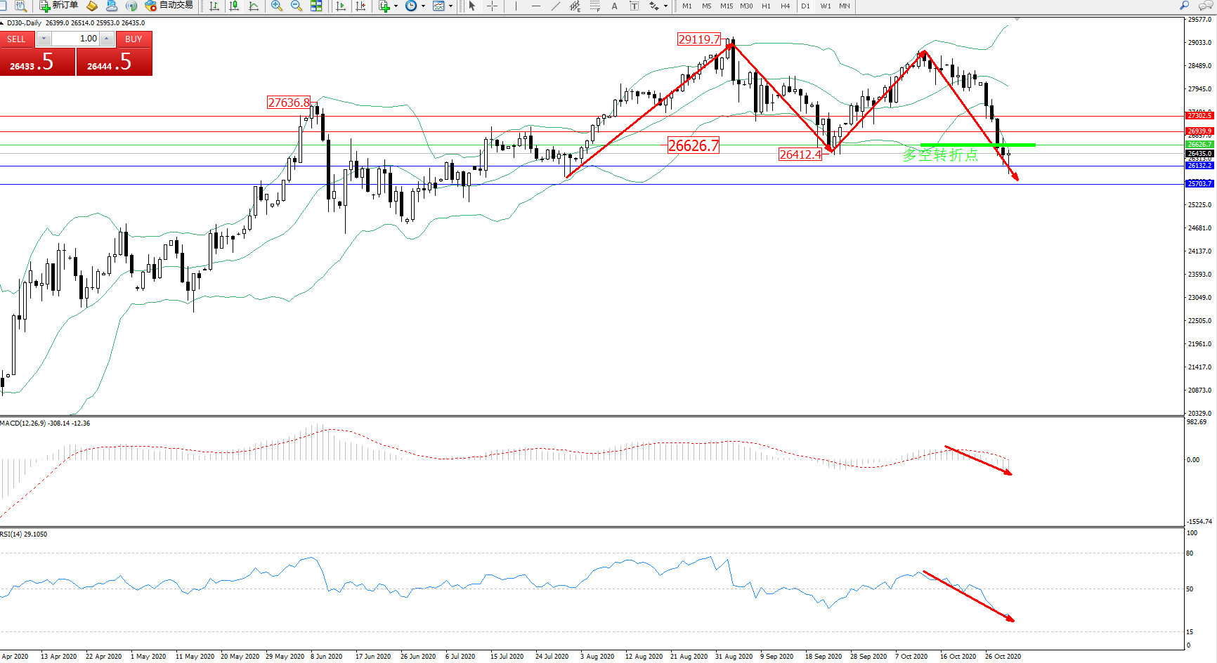 道琼斯指数10月30日(周五)收盘下跌157.50点,跌幅0.59%,报26501.60点。美股三大指数全线收跌股市下挫,创下自3月以来的最大单周跌幅,此前公布的科技公司业绩令投资者失望,担心经济放缓将拖累企业盈利。10年期美国国债收益率升至6月以来的最高水平。美元周五维持本周早些时候的涨势,创下9月以来最大单周涨幅,因美国股市在科技公司业绩令人失望之际维持跌势。接下来一周将有包括美国大选在内一系列可能驱动市场的事件,伴随着月末投资组合重新平衡,如果民主党候选人拜登战胜美国总统特朗普,可能会改善美国宏观经济增长的前景。美联储发表声明,调整主街计划,美联储将主街计划的最低货款额从25万美元下调至10万美元,旨在鼓励小额贷款。