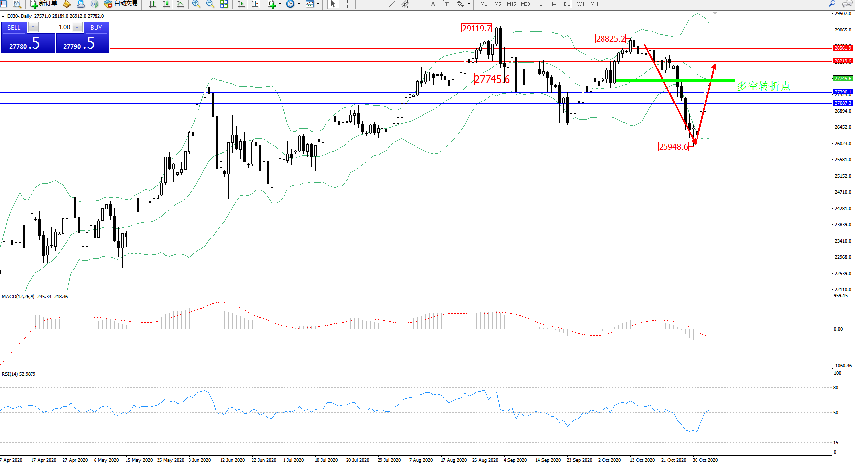 道琼斯指数11月4日(周三)收盘上涨367.60点,涨幅1.34%,报27847.66点。美股三大指数集体收涨,道指初步收涨约1.3%,盘中一度涨超800点,美大选进展十分焦灼。除密歇根州外,特朗普竞选团队4日还宣布,将在宾夕法尼亚州采取法律行动。他们正在宾州就民调观察员和选民身份证明法提起诉讼。美国国债交易员正放弃对更多财政刺激措施出台的押注,使国债收益率重挫,在财政刺激缺席的前景下,美联储支持经济的压力上升;美国大选结果尚未出炉,但没有一党大获全胜的可能性打击了新一轮刺激措施出台的希望,颠覆了看空美国国债的主流观点。就连美国周三公布创纪录的季度发债计划,也未能遏制美债数月来单日最大幅度的上涨,发债重心略微偏向短端,帮助收益率曲线趋平。