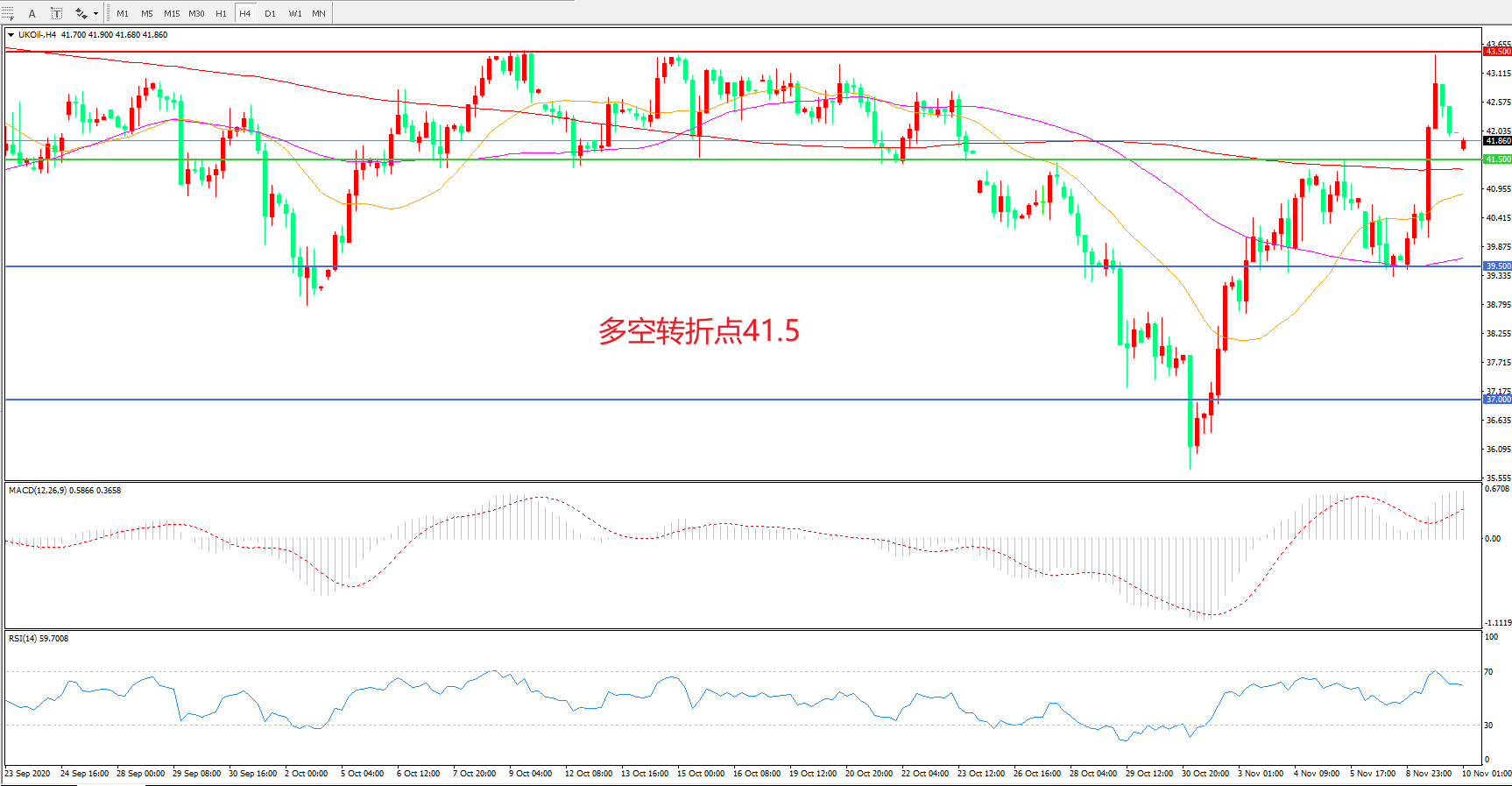 周一(11月9日),新冠疫苗突现重大利好,美国辉瑞制药和德国合作伙伴宣布,其新冠候选疫苗的第3期临床试验中期分析取得重大进展,疫苗有效率超过90%,布伦特原油大涨超过8%,震荡回落后收报42.00美元/桶。