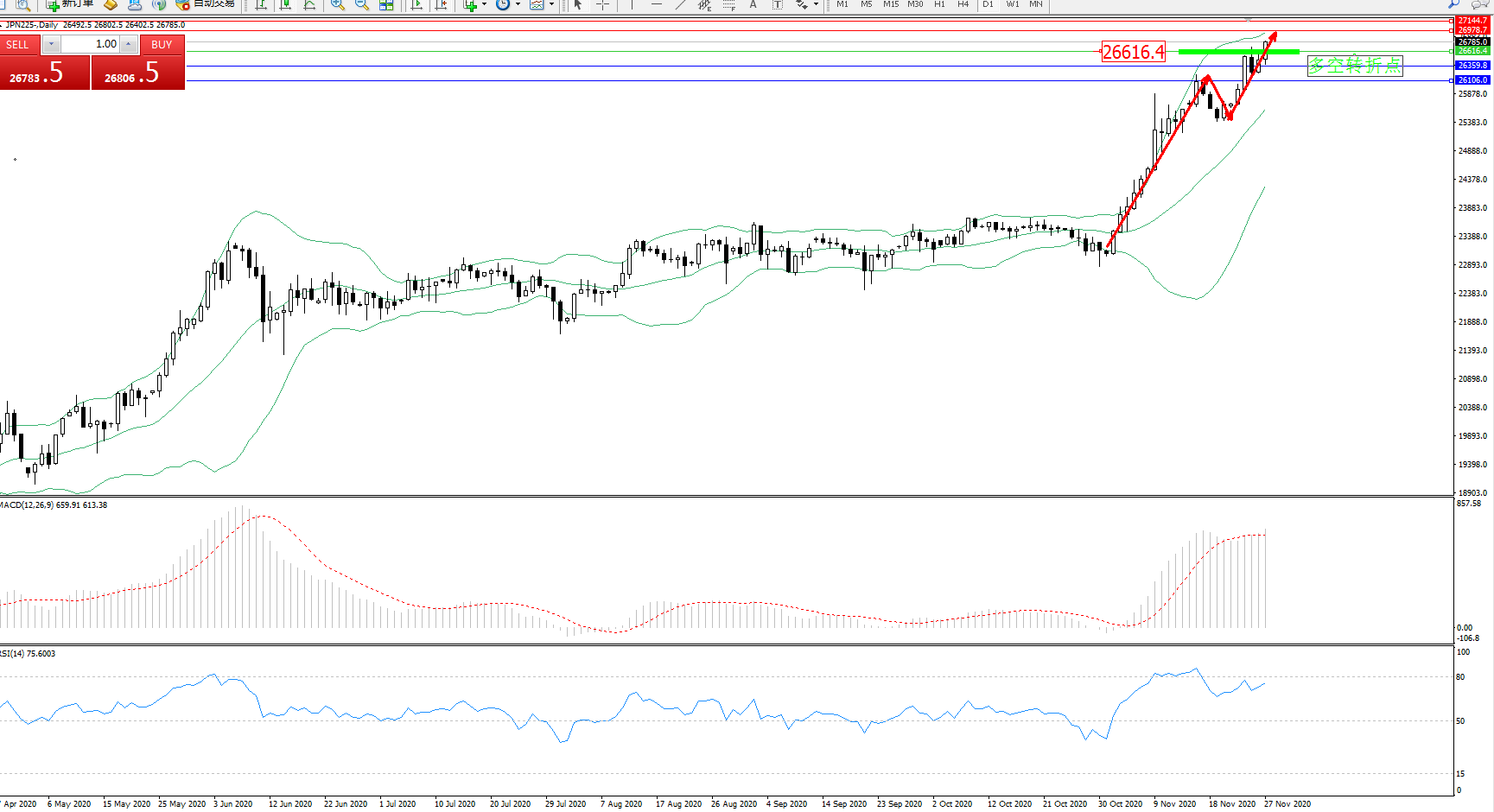日经225指数11月27日(周五)收盘上涨96.69点,涨幅0.36%,报26634.00点。日本执政党自民党日本执政党自民党敦促政府扩大,创建新的国家贷款担保计划,以支持受疫情冲击的企业。呼吁政府采取措施促进电动汽车、电池的发展。日本财务大臣麻生太郎:额外预算必须帮助疫情后的经济。向单亲父母提供现金援助的决定尚未做出。地区性银行必须在类似合并这样的问题上自主决定。日本央行:计划在12月保持当前的债券购买速度。美元指数在美国感恩节假日期间受美国政局风险延续的拖累而继续承压,投资者加倍押注美联储之后会有进一步的宽松行动。美国即将发布大量重要经济数据,可能显示经济放缓。美国股市期货承压,美国国债小幅上涨,阿斯利康发布声明称,由于当前研究引发质疑,可能会在全球进行新一轮新冠疫苗试验。