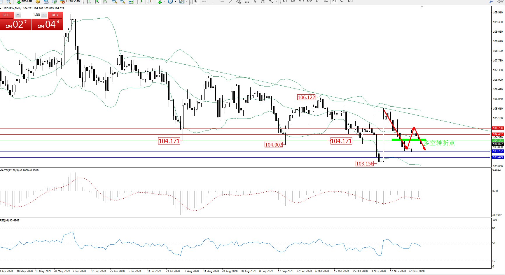 交易策略:104.171下方看跌,目标103.702、103.429