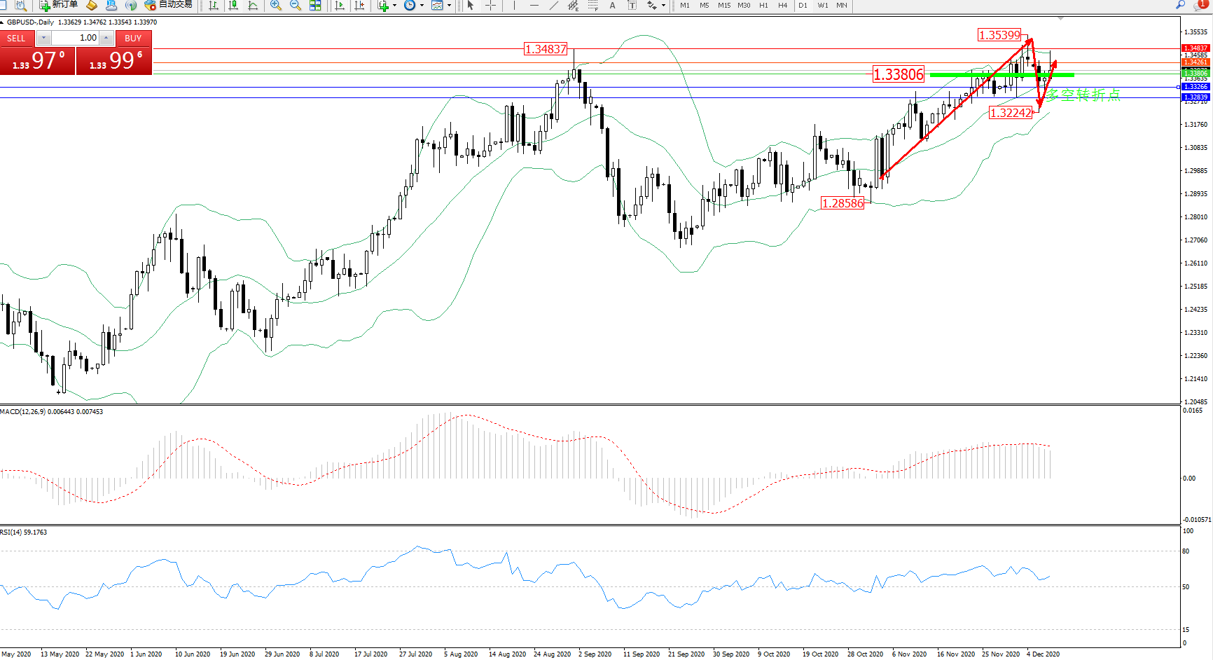 备选策略:1.33806下方看跌,目标1.33266、1.32839