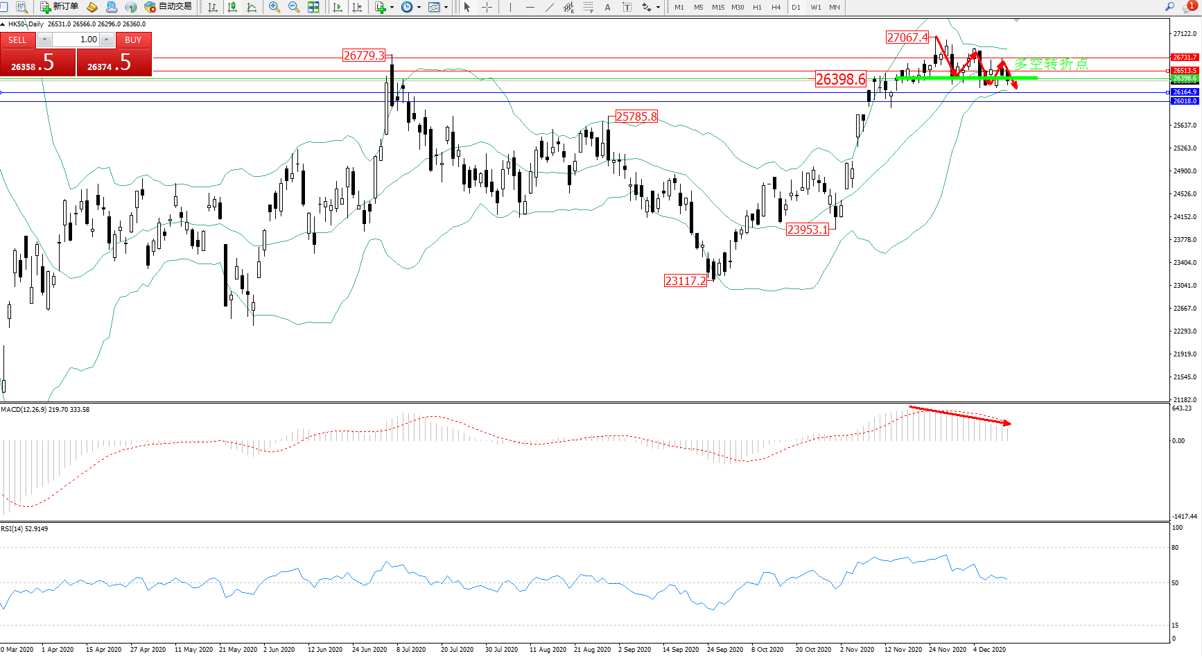 香港恒生指数12月14日(周一)收盘下跌116.35点,跌幅0.44%,报26389.52点;港股恒指震荡收跌,午后开盘曾现直线下跌;恒生科技指数收涨0.6%。恒生科技股涨跌各半,大型科技股分化,小米大涨近6%创新高,市值达7342亿港元,港股市场互联网巨头股集体大跌,美团上午一度跌超7%,腾讯跌近3%;在线教育股、乳制品、军工股现普涨行情,煤炭板块领跌,纸业股、钢铁股、航空股跌幅明显。今日南下资金净流入16.71亿港元,大市成交额为1433.07亿港元。上周五晚社区团购遭人民日报点名批评,周末又有多家供应商宣布禁止给“严重低价”的社区团购平台供货;今日市场监管总局官网再爆阿里、阅文和丰巢网络因违反反垄断法分别被罚50万元,这意味着反垄断正式开始付诸行动,市场监管总局还称正在依法审查虎牙与斗鱼合并等涉及协议控制架构的经营者集中申报案件。据港媒,香港特区政府卫生署卫生防护中心12月14日下午表示,香港新增82例新冠肺炎确诊病例,其中77例为本地病例,37例源头不明。