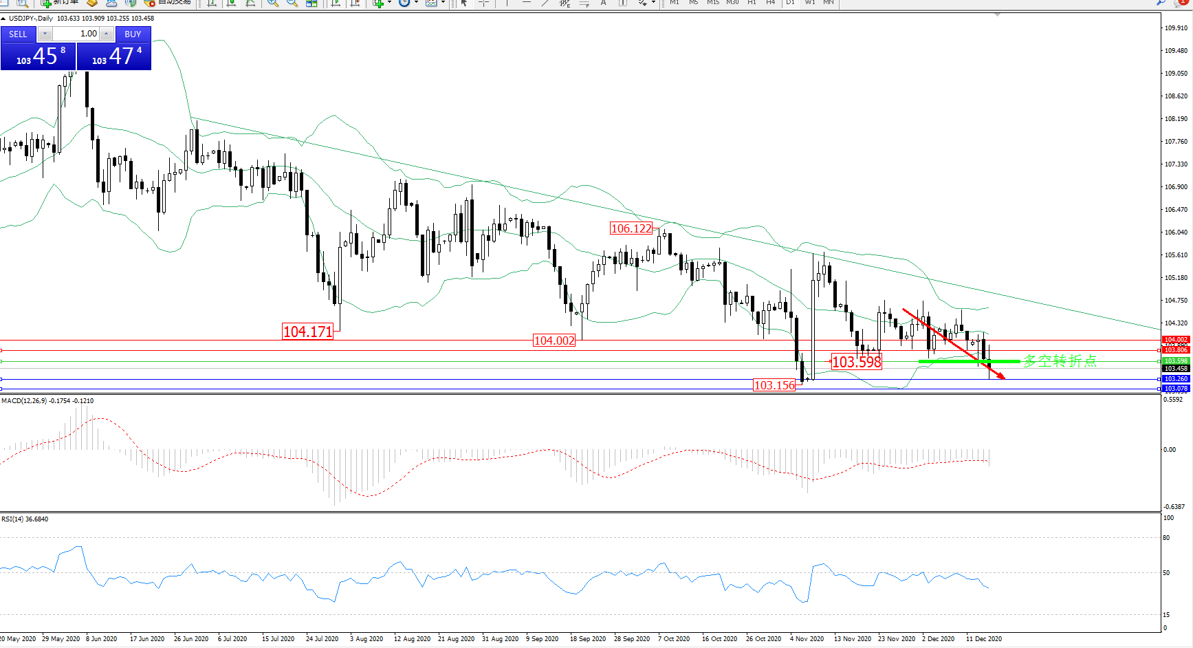 技术点评:空头动力维持在布林带指标通道低位窄幅整理走势中,布林带指标呈收口走势后开始张口向下移动中,延续下轨有继续下行态势,前期低位103.156位置近在咫尺破位在即,MACD指标处于0轴线下方空头区域维持窄幅整理平移,RSI指标处于50均衡线下方空头区域维持整理缓慢下行中;
