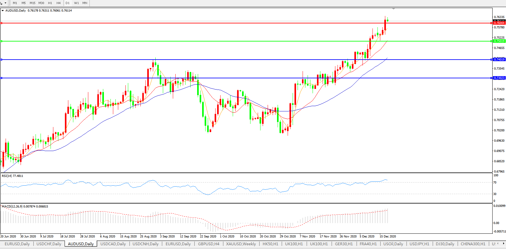 交易策略:0.7500上方看涨,目标0.7600、0.7700