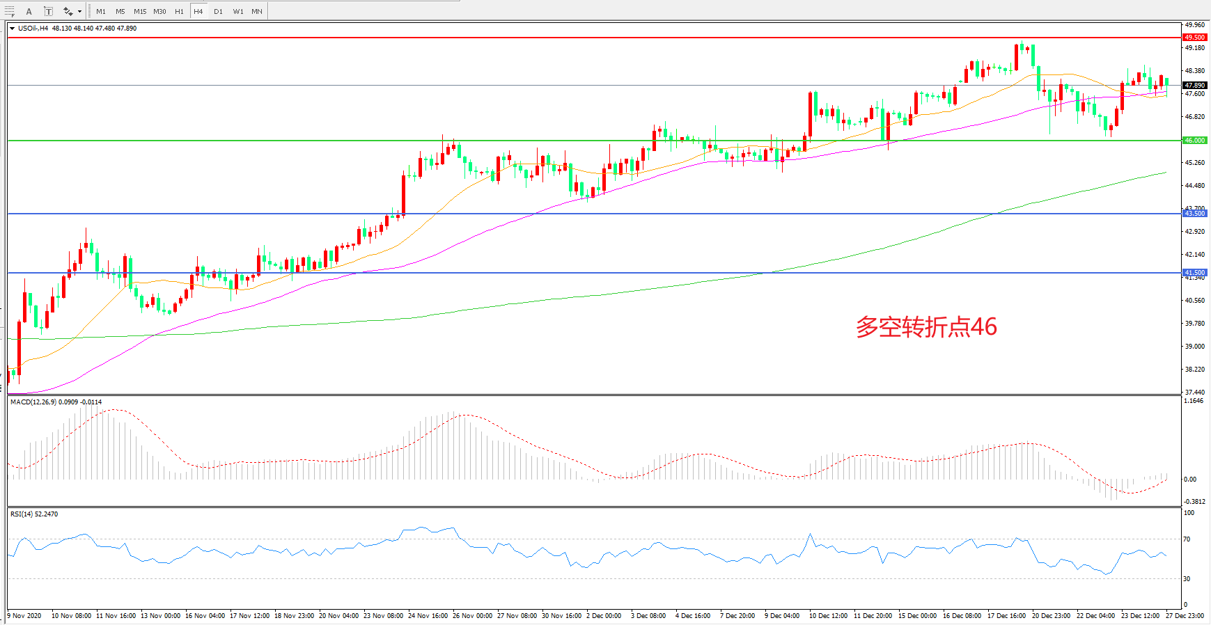 4小时图看,油价回踩21周期均线后震荡反弹,短期走势有所回暖,47美元再次成为下方支撑,MACD红柱增加,RSI指标向上,日内延续震荡概率较大。
