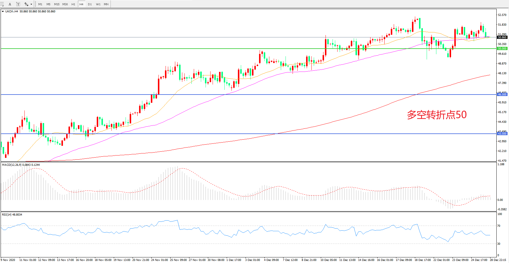 周一(12月28日),美国总统特朗普最终签署了9000亿美元的新冠纾困法案,但市场做多的动能已经大不如从前,布伦特原油先涨后跌,收报50.86美元/桶。从圣诞节之后的第一个交易日来看,成交量仍没有完全恢复,因此短期的市场走势还难以反映出全部的市场心态,但油价有短线二次探顶行情的迹象。