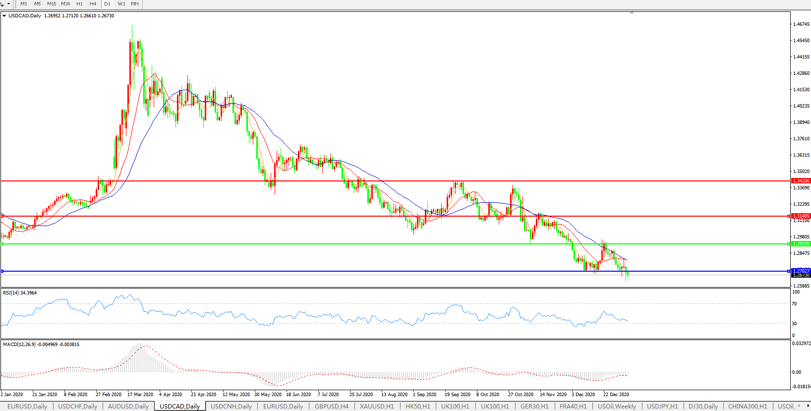 美元兑加元周三欧市盘中续跌触及2018年4月以来的低位1.2632,之后录得反弹。日内,美元指数在美国政局及经济政策不确定性前景影响下继续走弱,推动非美货币走强。而隔夜沙特意外宣布减产以来,国际油价大幅跳涨的状况,也对与油价关联密切的加元汇价带来了额外拉动效果; 不过,相比其他非美商品系货币而言,加元走势仍相对偏弱,尽管其一度得到了油价走高的加持,原因便在于在美国经济政治风险仍然居不不下的背景下,作为近邻的加拿大也会受到首当其冲冲击,而油价在市场避险情绪升温的背景下则脱离隔夜高位再度回落。而市场目标也因而更多转向了本周五美加两国的12月就业数据对比上,在此之前,美元兑加元暂时仍可在1.26关口上方获得支撑,阻力位则在前期低点水平1.2688,升破后进一步上看至1.2725一线”。