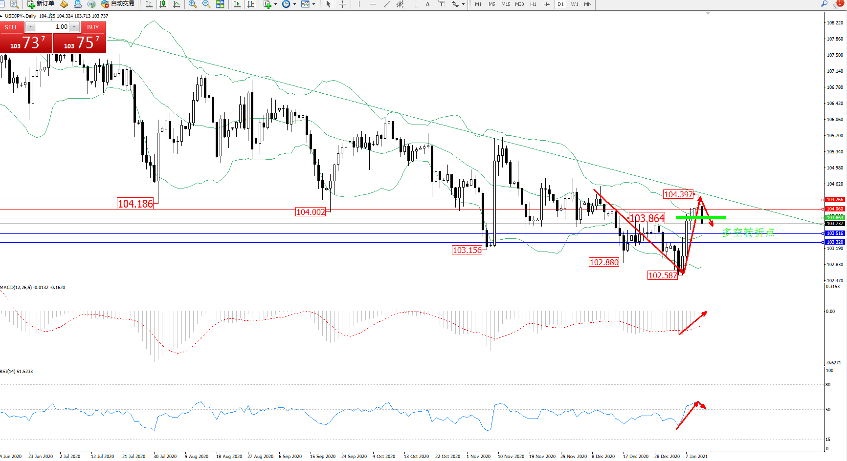 技术点评:空头动力延续布林带指标通道内持续震荡下行至102.587位置后得到支撑开始强势反转拉升上扬,高位抵达104.397位置遇阻回撤,空头动力伺机再度入场下行,处于布林带指标通道中上轨区间持续震荡中,关注中上轨区间关键节点,布林带指标呈缓慢张口走势中,MACD指标处于空头区域弱势震荡上移至0轴线附近徘徊,RSI指标低位多头动力上攻至50均衡线上方持续震荡整理中;