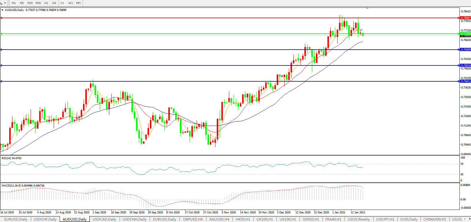 交易策略:0.7700下方看跌,目标0.7600、0.7500