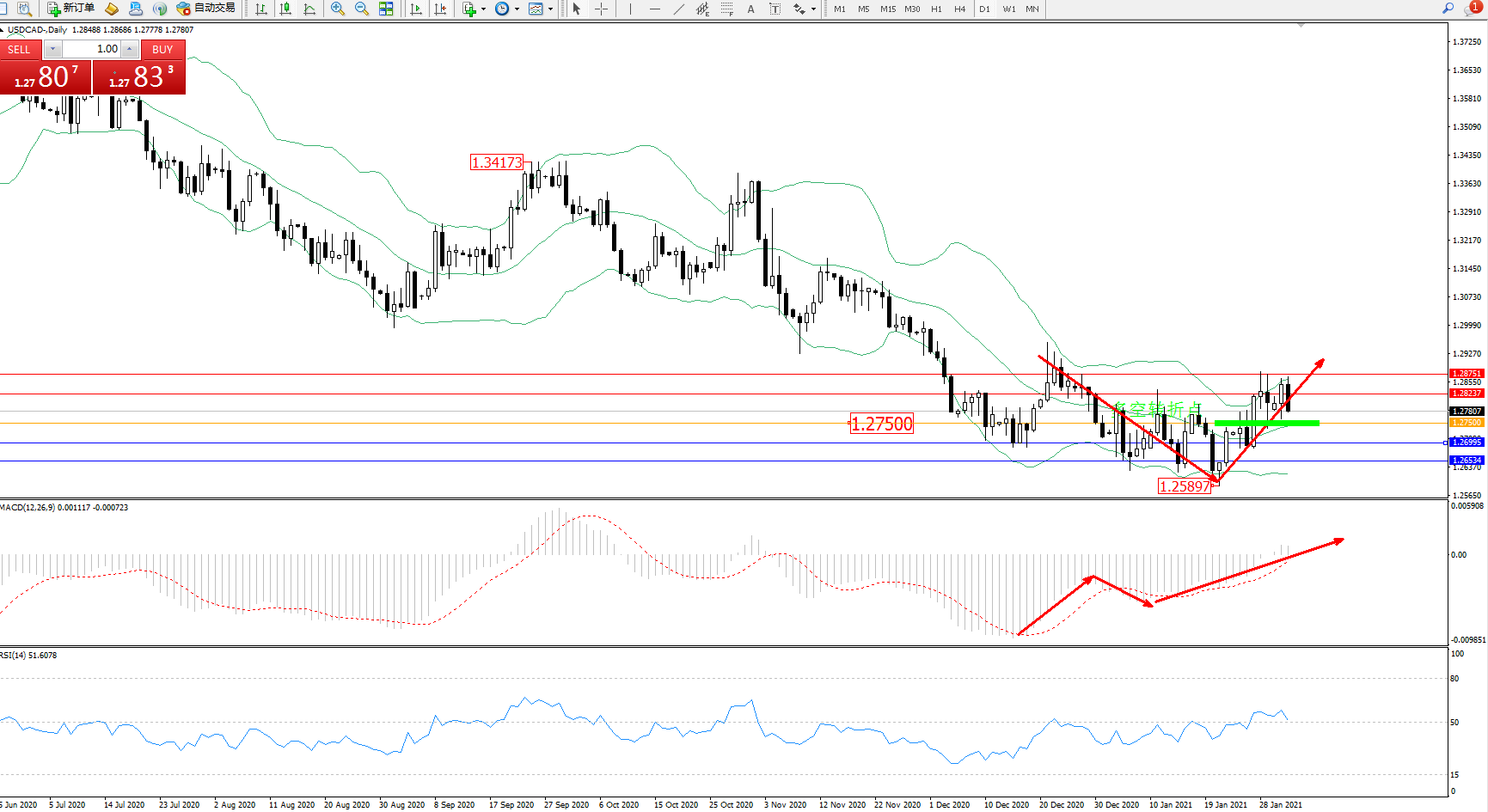 交易策略:1.27500上方看涨,目标1.28237、1.28751