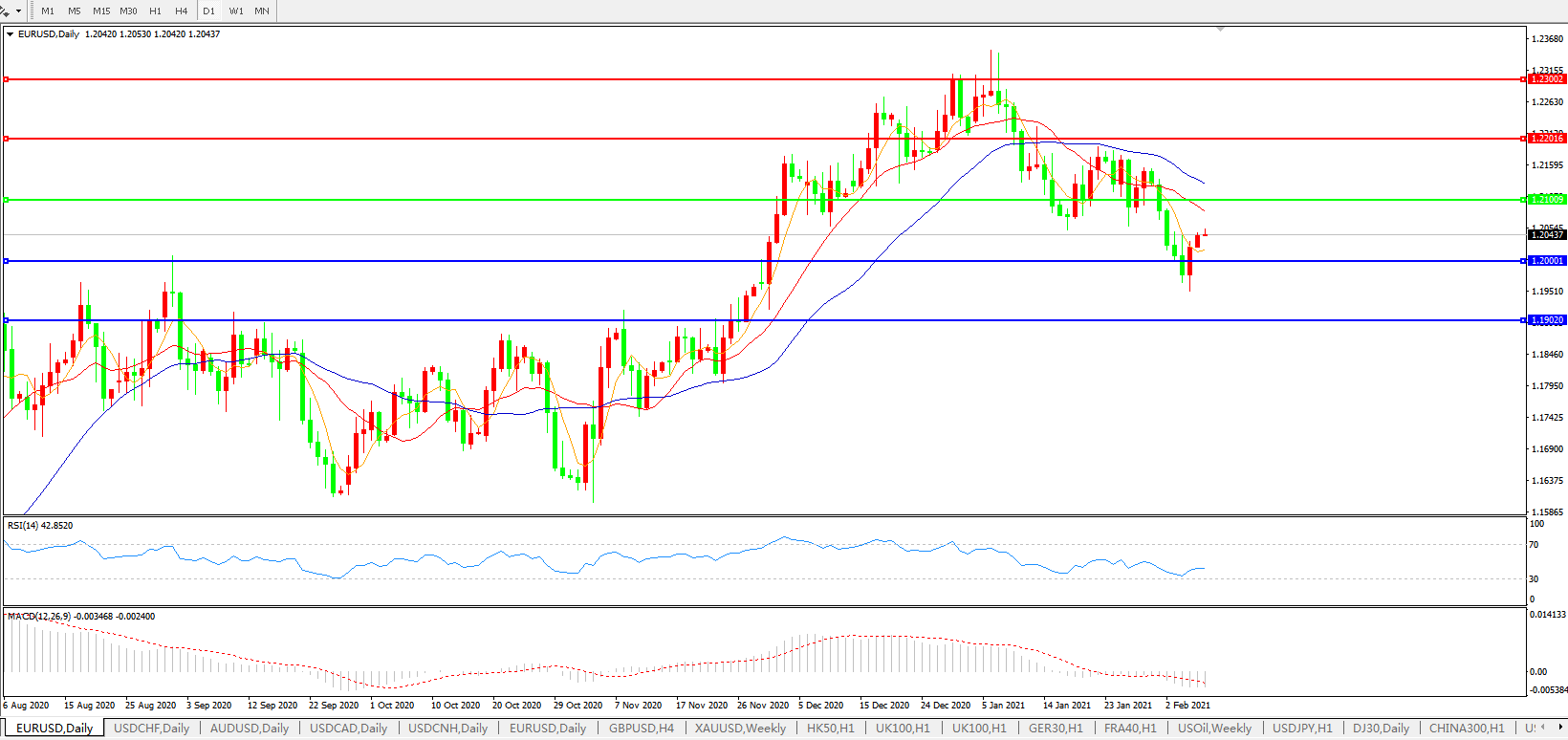 交易策略:1.2100下方看跌,目标1.2000、1.1900