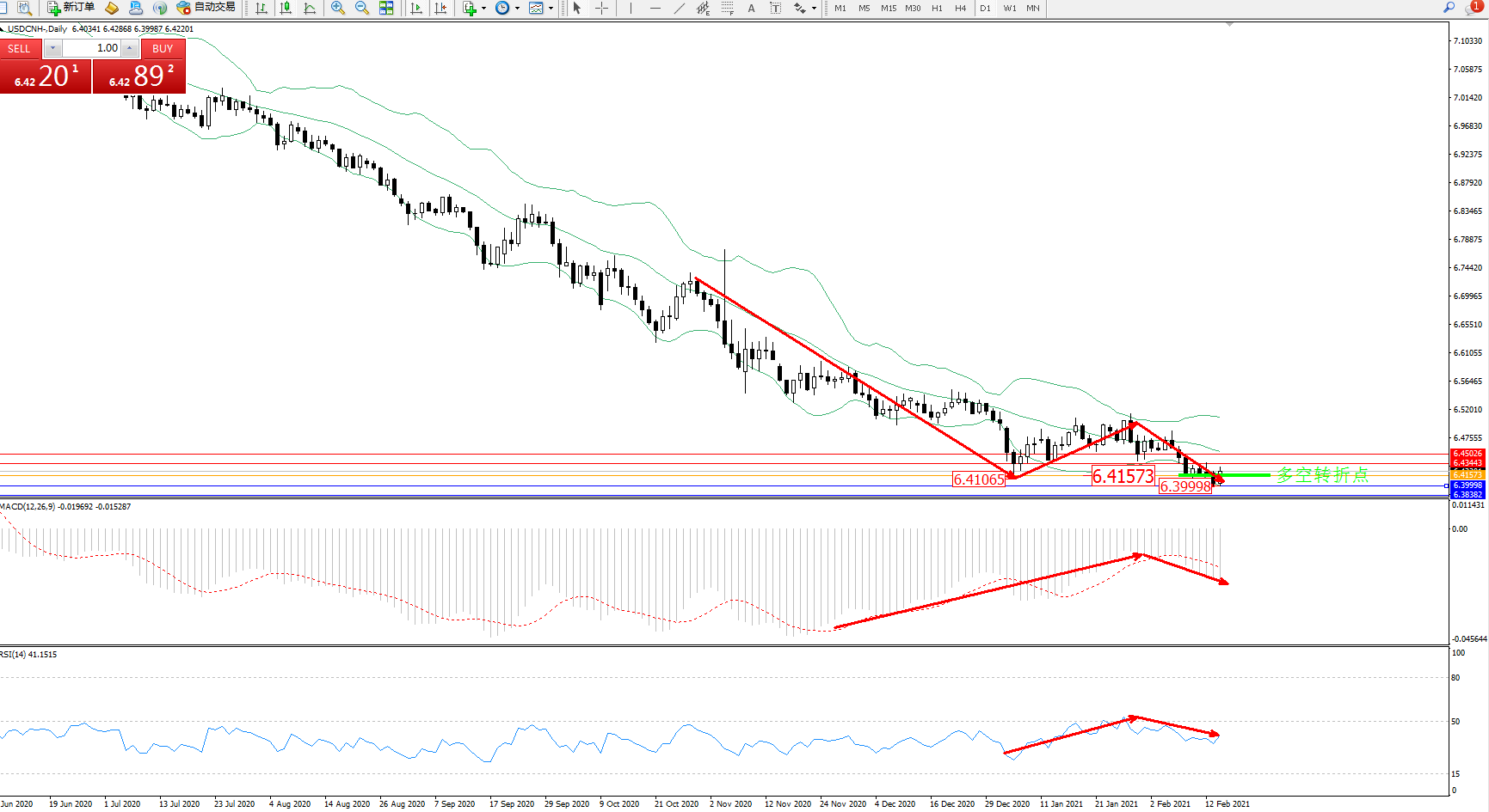 美元兑离岸人民币在周一逼近6.40关口后暂时小幅反弹,处于6.42201附近整理,,基于中国经济强势的基本面状况,人民币汇价仍不排除相对美元进一步上行的空间。预计在本周四中国内盘市场恢复交易后,进一波的行情动能就将萌发,可能会在短线将美元兑离岸人民币汇价进一步打压至6.38一线。中国人民银行近期发布数据显示,2020年末,人民币普惠金融领域贷款余额21.53万亿元,同比增长24.2%;全年增加4.24万亿元,同比多增1.75万亿元。