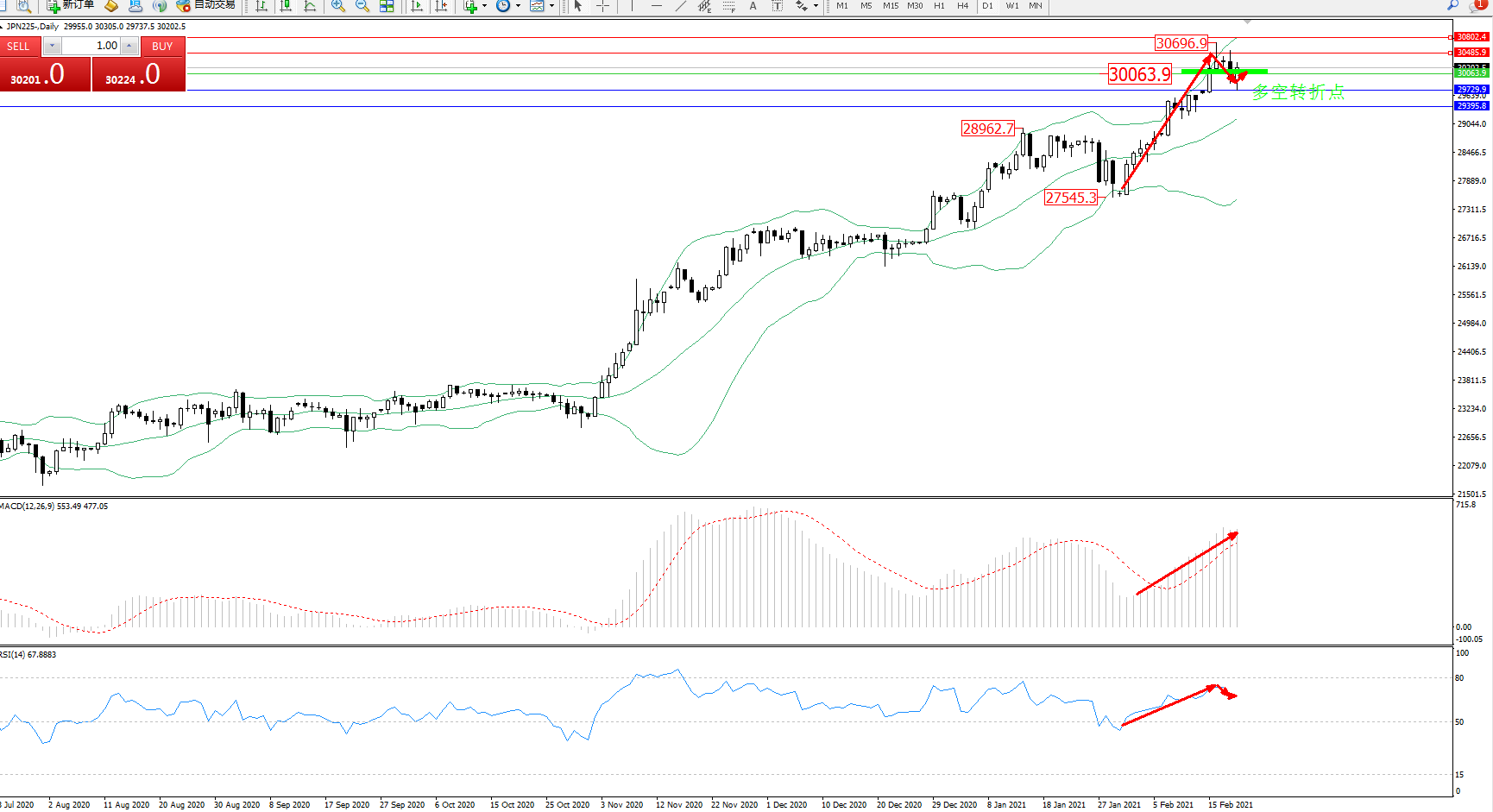 日经225指数2月19日(周五)收盘下跌224.59点,跌幅0.74%,报30011.50点。随着全球制造业活动回暖,日本1月工业生产可能出现三个月来首次增长,给受疫情重击的日本经济带来了一线希望;衡量消费者支出关键指标的零售销售可能连续第二个月萎缩,这表明疫情继续抑制消费;由于包括东京在内的某些地区进入紧急状态,以遏制重创企业和消费者的新冠病例,因此本季度经济将萎缩;日本1月工厂产出料较前月增长4.0%,12月修正后为下降1.0%。日本政府:由于疫情的严重影响,日本经济虽然有所改善,但仍显示出一些疲软。提高了对资本支出、进口和企业利润的看法。连续三个月削减消费者支出预估。日本自2020年4月以来首次下调对整体经济的看法。
