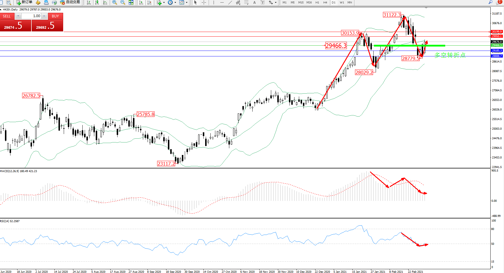 技术点评:高位空头动力持续震荡回撤至布林带指标中下轨区间维持宽幅震荡走势中,低位抵达28779位置后得到短暂支撑开始震荡上移,触及布林带指标中轨附近节点后开始徘徊,低位多头动力有伺机反转上移迹象,空头动力短期开始减弱,布林带指标呈张口走势后开始收口,MACD指标处于多头区域维持震荡回撤下行后开始走缓,RSI指标纠结于50均衡线下侧弱势整理后有反转上移迹象;