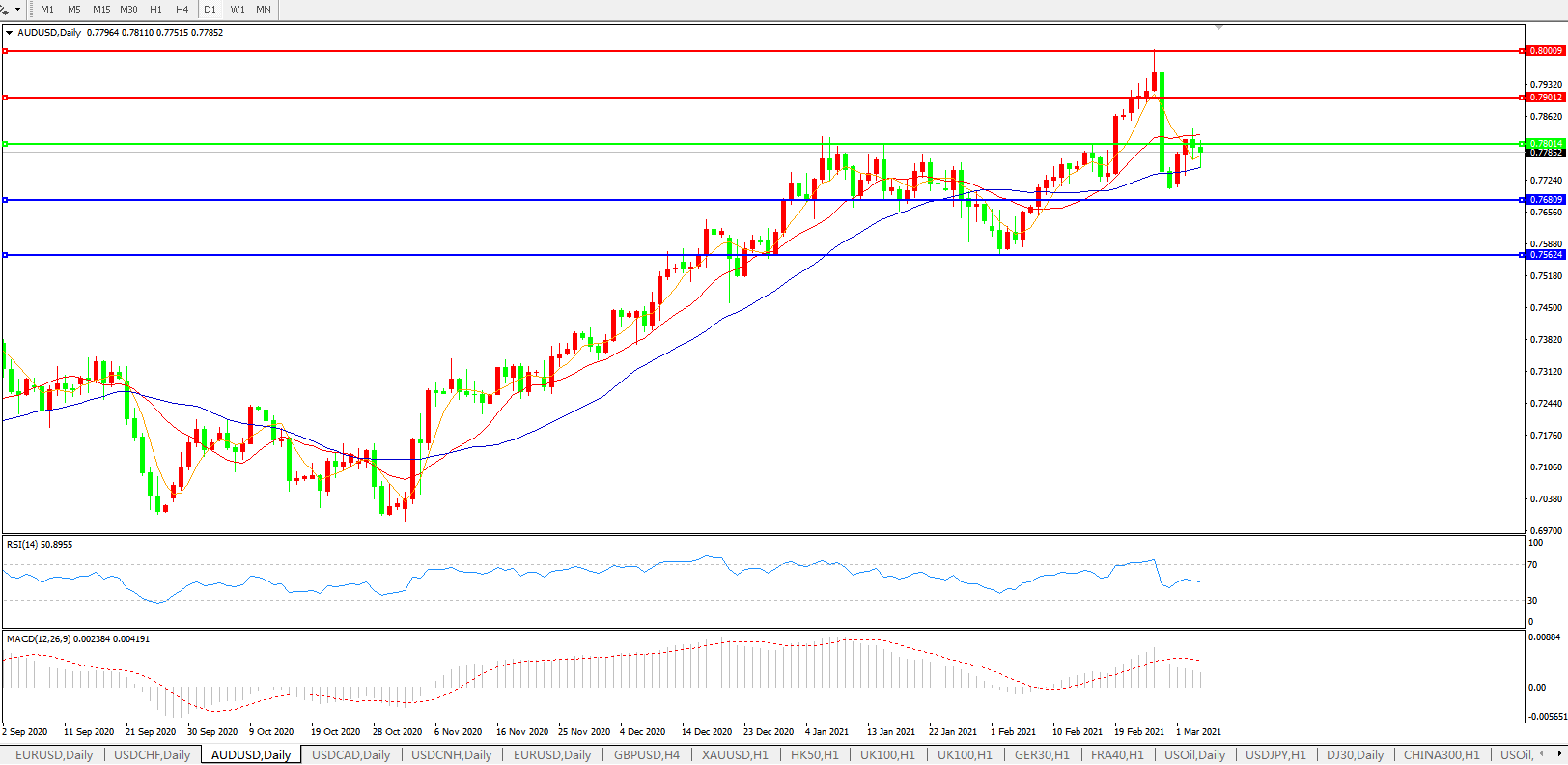 备选策略:0.7800上方看涨,目标0.7900、0.8000