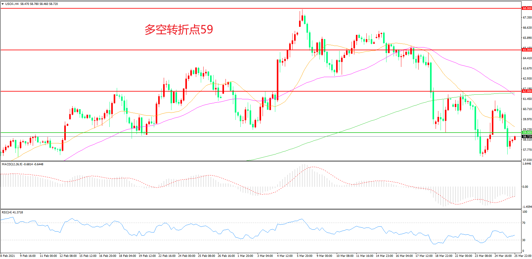 4小时图看,油价冲高反弹后再次下破,整体表现十分低迷,空头趋势明显,21周期均线形成上方阻力,56美元成为短线支撑,MACD绿柱增加,RSI指标走平,日内延续震荡概率较大。