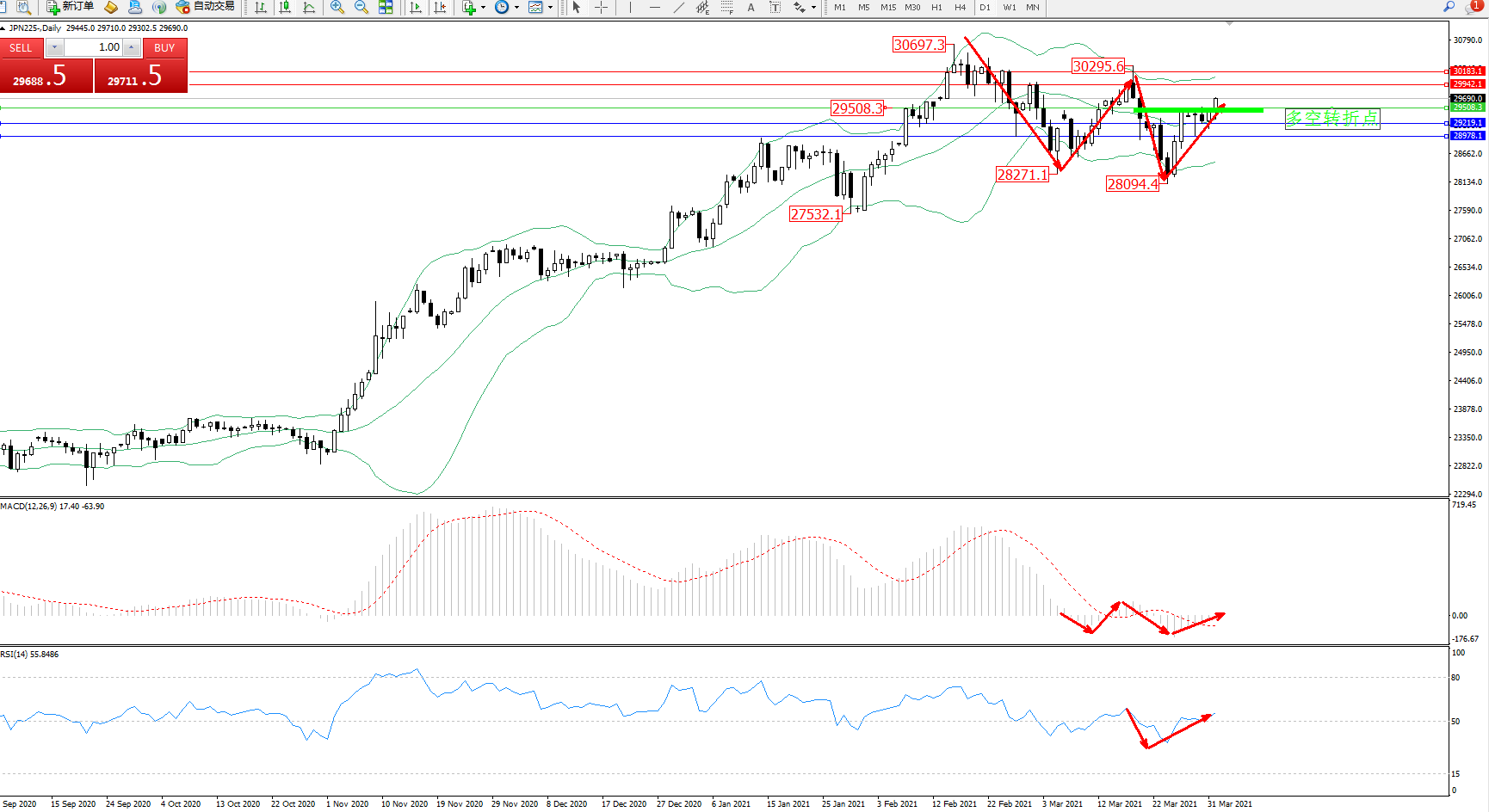 日经225指数4月1日(周四)收盘上涨248.20点,涨幅0.85%,报29427.00点。日本大型制造业信心第一季升至疫情前水准,且企业计划今年增加资本支出,表明日本出口型经济在受益于全球需求的稳步复苏;日本央行备受关注的短观调查显示,3月大型制造业景气判断指数由12月的负10升至正5,为连续第三季改善,并创2019年9月以来高位,且优于市场预估的零。3月大型非制造业景气判断指数从12月的负5升至负1;大型企业预计,在4月开始的财年资本支出将增加3.0%,预估中值为增加1.4%;日本第一季经济可能萎缩,但因强劲的出口抵消部分低迷的消费,日本经济将逐步走出低迷;日本央行短观调查的景气判断指数由看法乐观的受访者百分比减去悲观者百分比得出,数值若为负说明悲观者多于乐观者。