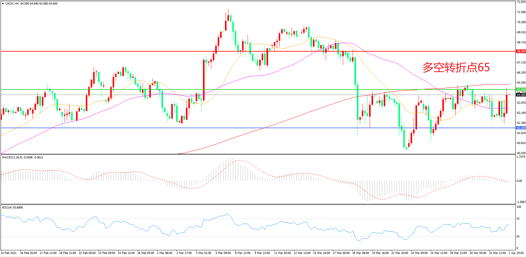 周四(4月1日),以沙特和俄罗斯为首的OPEC+产油国联盟召开部长级视频会议谈判5月石油政策,在市场普遍预期减产的情况下,OPEC+最终还是决定未来三个月内逐步增加产量。这种打破预期的决策一度令油价大幅下跌,但在各国良好数据的支撑下,市场更看好全球经济复苏的前景,风险情绪推动油价转涨,布伦特原油震荡回升,收报64.60美元/桶。