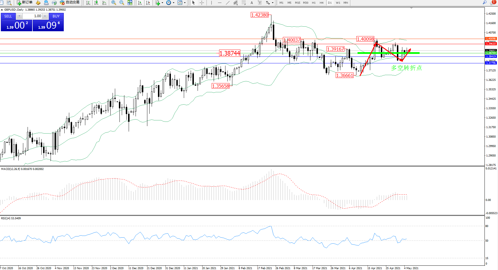交易策略:1.38744上方看涨,目标1.39610、1.40098