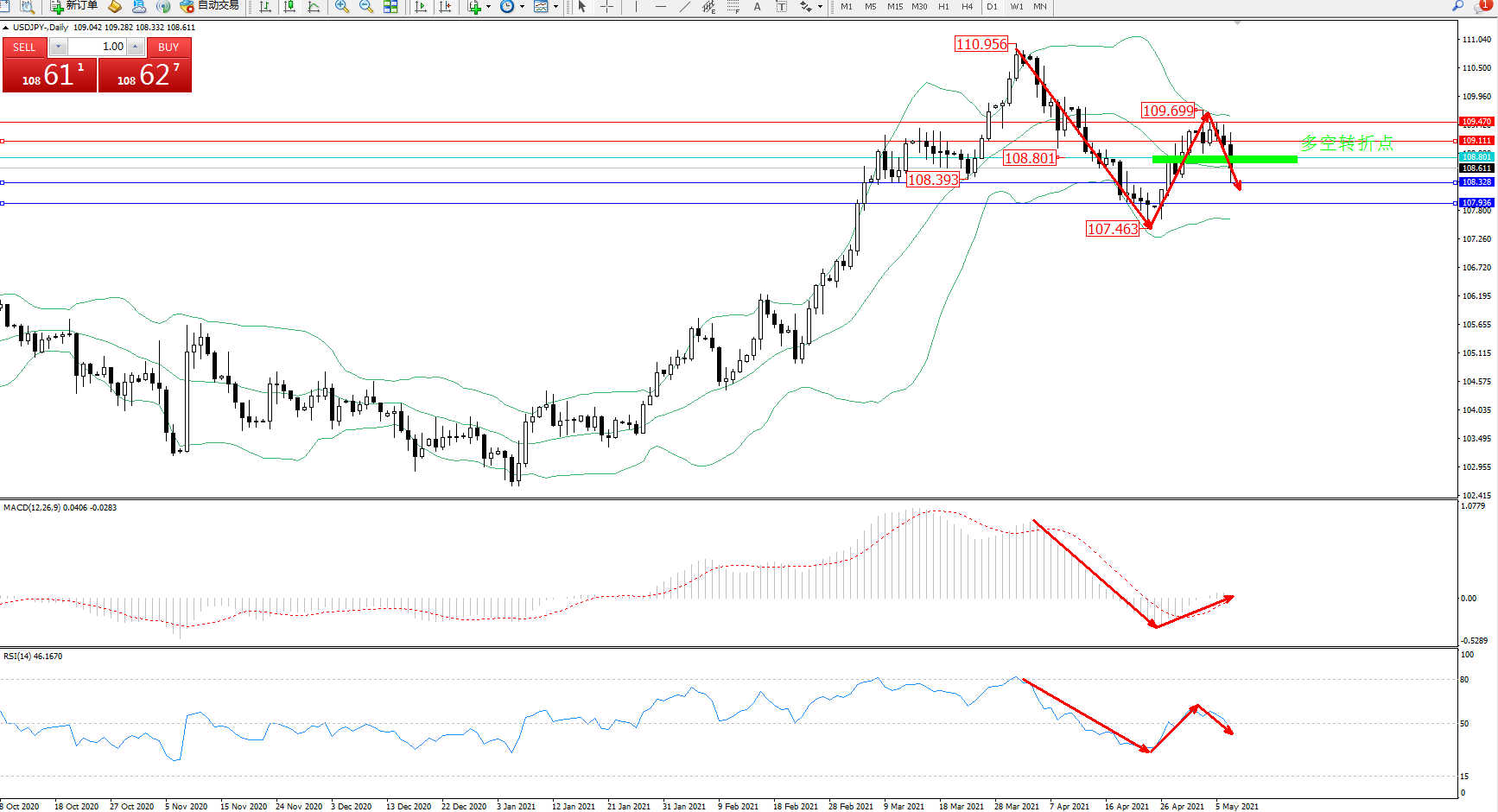 技术点评:高位空头动力延续空头下行走势持续下挫,触及布林带指标下轨附近节点后不断向下移动,空头动力下行至107.463附近得到支撑短暂整理后急速回升,突破中轨触及上轨附近后遇阻维持震荡再度下挫,破中轨附近徘徊,布林带指标呈张口走势后开始缓慢收口中,MACD指标处于0轴线下方空头区域持续震荡后开始有回升迹象,RSI指标处于空头区域整理后急速反转上行,在50均衡线节点附近弱势震荡;