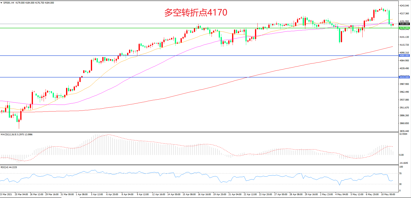 4小时图看,标普500长阴下破,前期涨幅被吞噬殆尽,但整体价格仍在多空分水岭之上,均线系统走平,MACD红柱缩短,RSI指标走平,日内延续震荡概率较大。