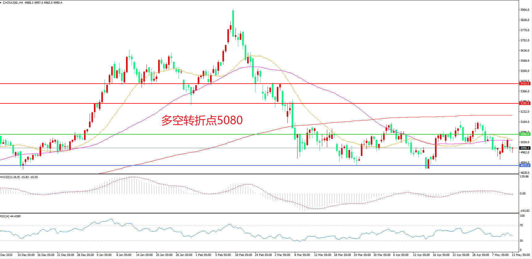 周四(5月13日),A股三大指数低开高走,热点题材股表现活跃,市场整体延续宽幅震荡的格局,沪深300低开低走,收报4990.4点。两市合计成交8017亿元,北向资金净卖出56.4亿元。目前大盘反弹受到中长期均线明显压制,在成交量不能明显放大背景下,重要均线很难突破。