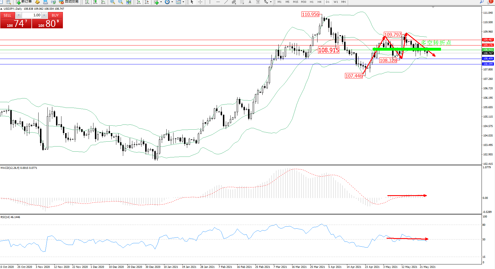 交易策略:108.915下方看跌,目标108.409、108.099