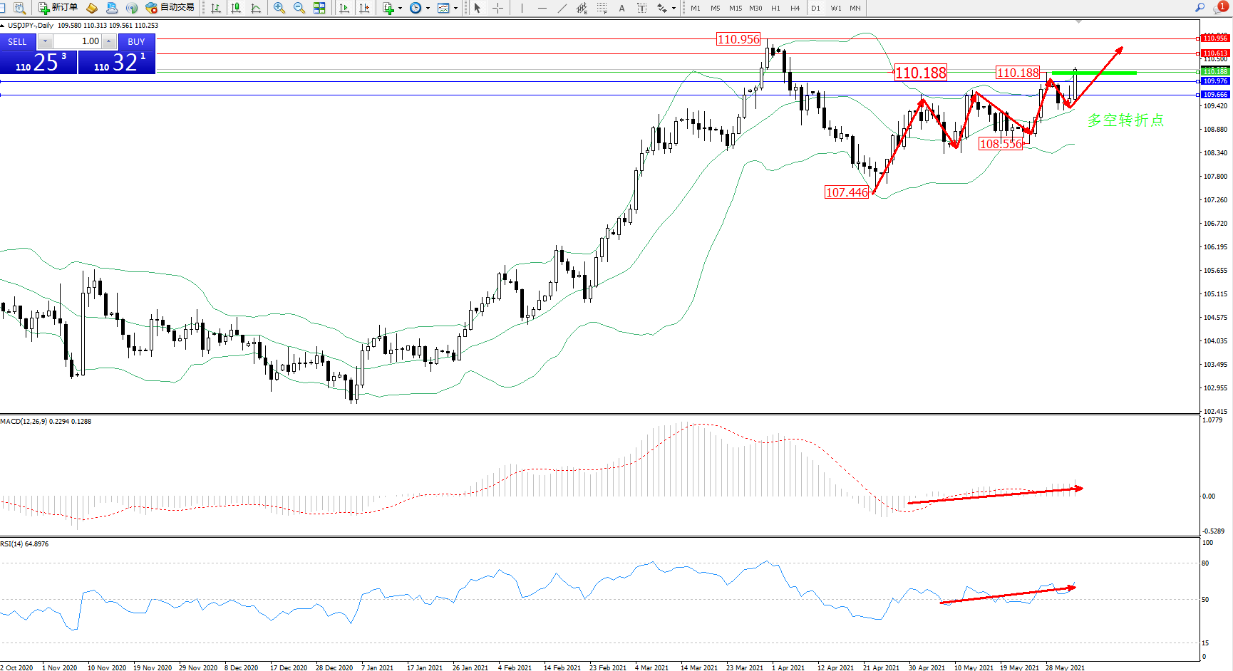 美元兑日圆维持110.253附近震荡,美元兑日元大幅上涨,受益于超强的ADP就业数据,短线有望继续上攻并挑战阶段高点110.97,数据一出,美元指数开始强劲走高,并带动美元兑日元走强。日本国内,由于病例激增,在大部分地区实行紧急状态,有些地区的限制将持续到6月20日。日本从2月份才开始接种疫苗,晚于大多数发达国家。到目前为止,只有290万人(占日本人口的2.3%)完成了两针疫苗的接种。近期美元两次试图上攻,均无功而返,不过在经历了4月非农的低迷之后,5月非农有望迎来转机。ADP作为非农的先行指标,似乎预示着非农数据的强劲。