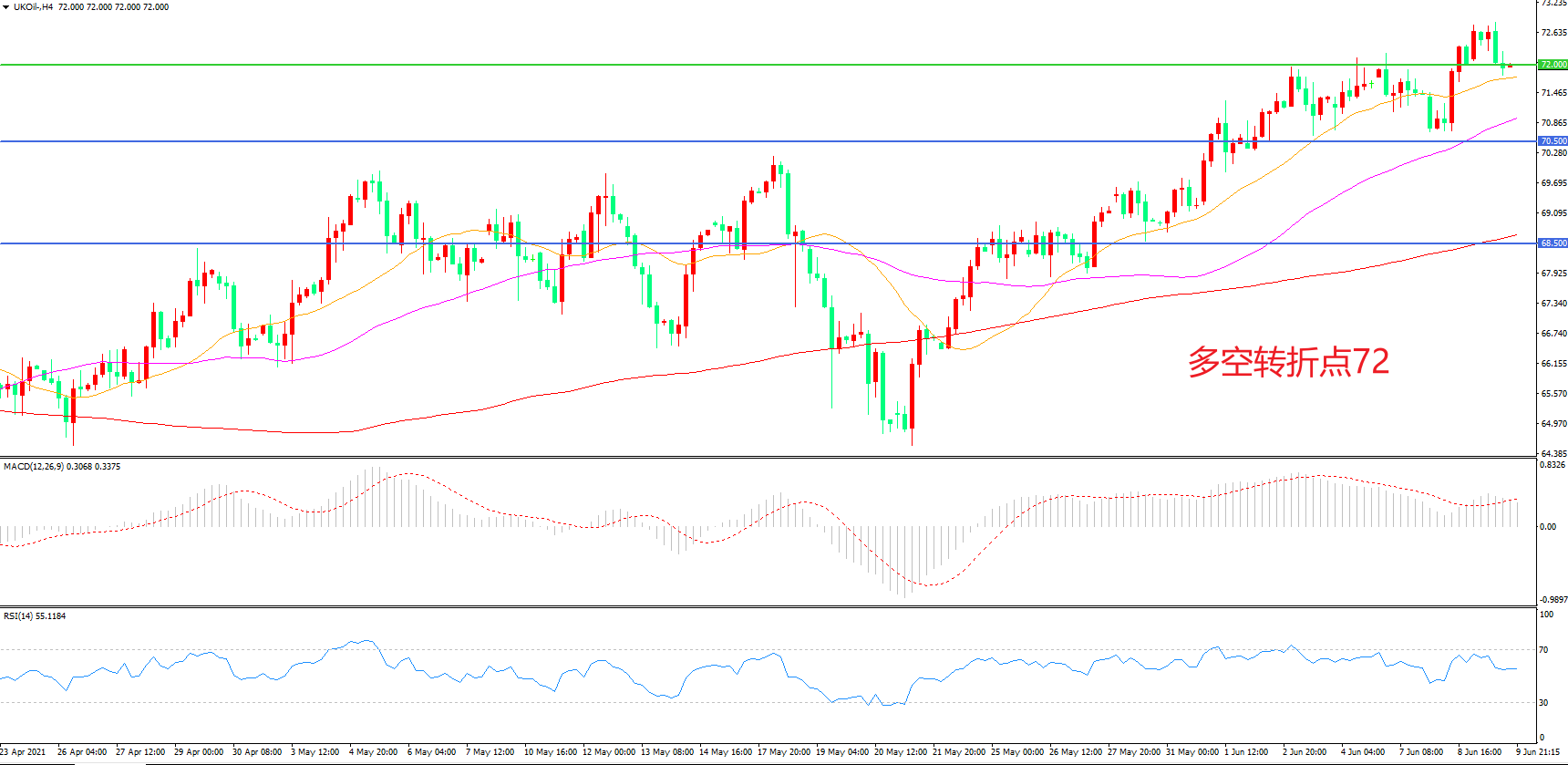 周三(6月9日),美国能源信息署公布的EIA数据显示,当周EIA原油库存锐减524万桶,但汽油和精炼油库存迅速超预期累积超乎了市场的预期,布伦特原油震荡回落,收报72.00美元/桶。盘面上看,在布伦特冲击75美元没有站稳后,还是需要注意投资者心理的微妙变化,考虑到油价已经连续上涨了近3周时间,油价短线面临调整压力。