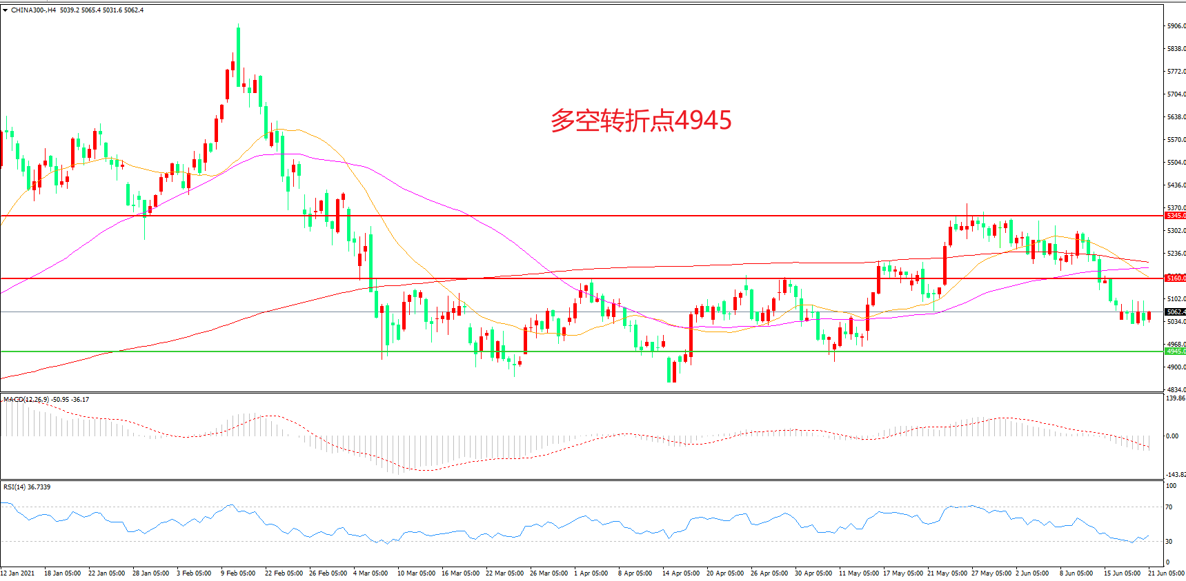 周一(6月21日),沪深两市双双低开,开盘后展开拉升,指数连续上行并顺利翻红走高,沪深300延续低位震荡,收报5062.4点。两市合计成交超过一万亿元,北向资金净卖出20亿元。由于上周的连续放量阴线吃掉了之前的连续阳线,使得技术面走势变差,未来需要震荡整固才能使指数上涨更加有力量,市场或保持当前波澜不惊的平稳运行不变。
