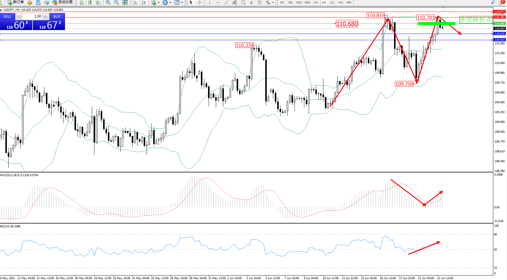 技术点评:多头动力触及高位110.819位置后遇阻回撤,抵达109.706位置强势反转上扬,高位再度抵达110.781位置后,呈双顶M型态开始调整,高位空头动力有继续回撤迹象,高位抵达布林带指标上轨附近节点遇阻,布林带指标呈张口平移走势持续中,MACD指标处于0轴线上方多头区域维持震荡上扬中,RSI指标处于50均衡线上方多头区域持续震荡上行后开始平移;