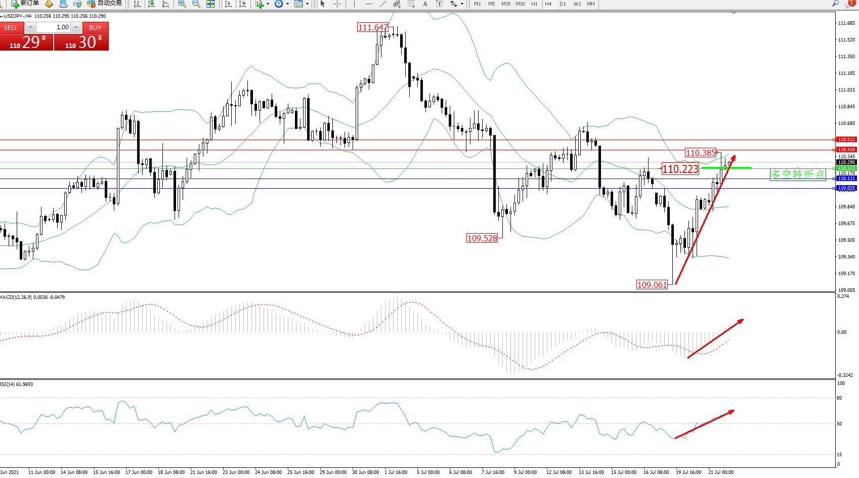 技术点评:低位多头动力持续震荡上扬,触及布林带指标上轨附近节点110.385位置附近后遇阻短暂震荡,多头动力仍有向上移动态势,布林带指标呈张口走势持续中,MACD指标低位多头动力持续震荡上移至0轴线上方弱势徘徊,RSI指标处于多头区域维持震荡向上移动中;