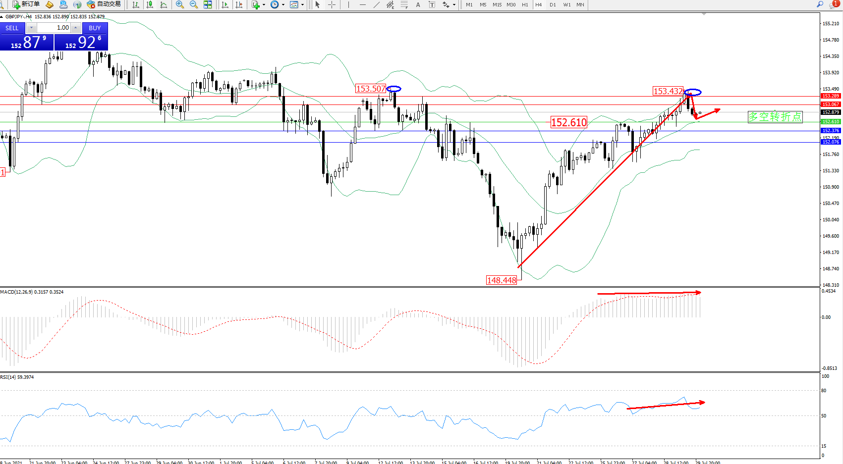 技术点评:多头动力延续布林带指标通道中上轨区间持续震荡上扬,前期高位153.507位置近在咫尺破位在即,布林带指标呈上扬趋势走势态势良好,MACD指标处于多头区域高位维持整理徘徊平移,RSI指标处于50均衡线上方多头区域持续震荡中;