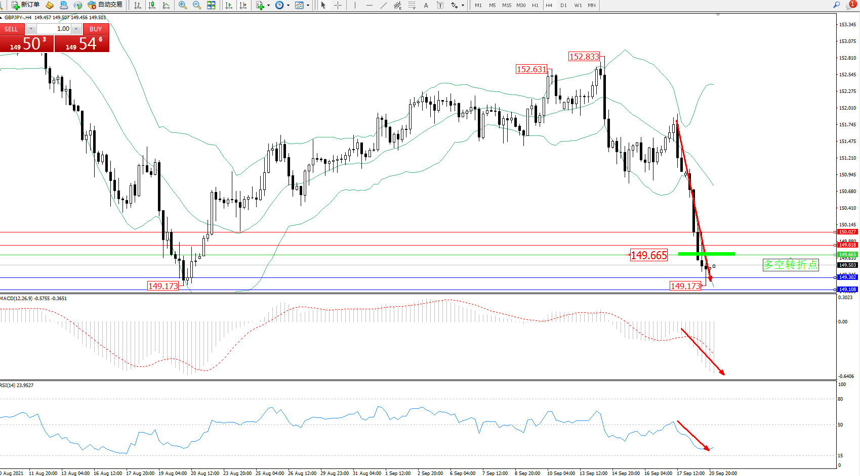 技术点评:空头动力延续布林带指标通道下轨附近附近持续震荡向下移动,低位抵达149.173位置后开始整理,该位正是前期低位附近节点,短期或得到短暂支撑,但下行趋势态势良好,布林带指标呈张口走势持续中,MACD指标处于空头区域持续震荡向下移动中,RSI指标处于空头区域不断震荡下行后开始整理;