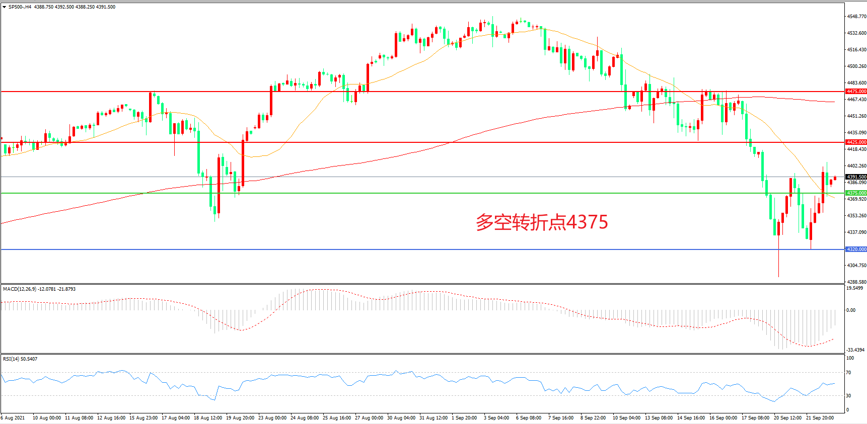 4小时图看,标普500回踩4320支撑后连续上行,短期走势回暖,4375成为短期多空分水岭,21周期均线成为下方支撑, MACD绿柱缩短,日内震荡上行概率较大。