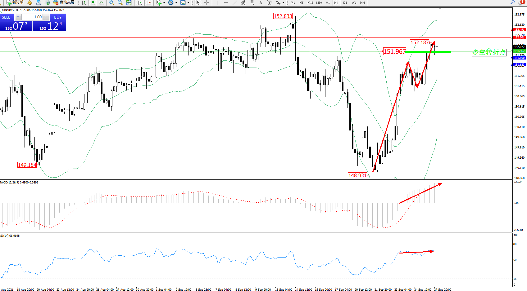 技术点评:多头动力延续布林带指标通道中上轨区间持续震荡上扬,高位滴滴152.187位置后开始短暂整理,多头动力有继续拉升上扬态势,布林带指标呈收口走势不断向上移动,MACD指标处于多头区域维持整理上移,RSI指标处于多头区域持续整理徘徊;