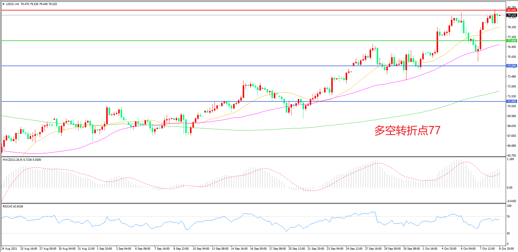 上周五(10月8日),在全球能源危机提振需求之际,OPEC+产油国仍保持偏紧的供应,美国经济数据整体乐观,国际局势改善,进一步提振需求前景,美国WTI原油震荡上行,收报79.52美元/桶。此前美国能源部表示,目前没有动用战略石油储备来为不断上涨的油价降温的计划,目前WTI原油正朝着连续第八周上涨的方向前进,这将是自2013年12月以来最长的连续上涨。