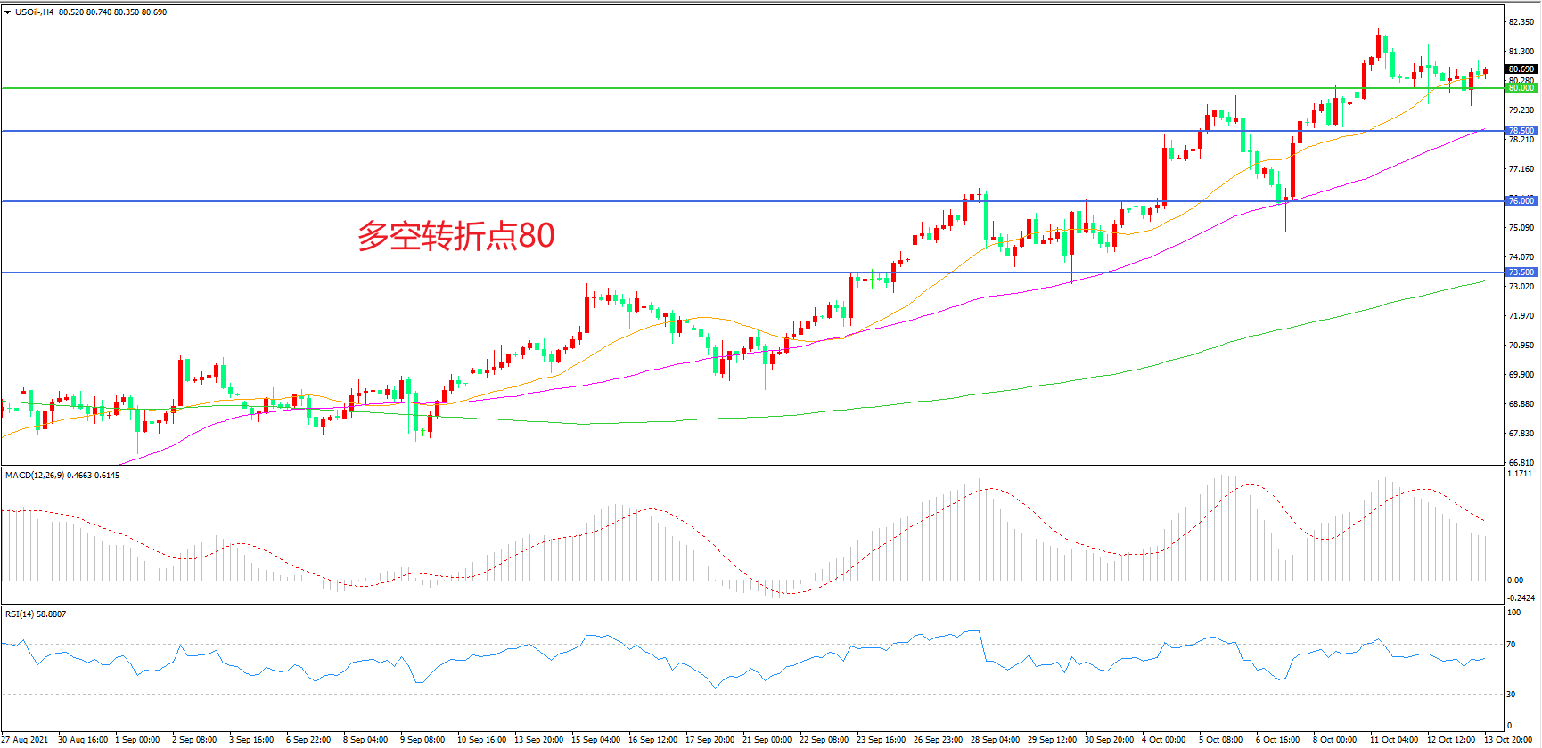 周三(10月13日),根据OPEC月报显示,尽管油价上涨,但OPEC成员国仍对石油需求持谨慎态度,将2021年全球石油需求增速预测下调16万桶/日,美国WTI原油延续窄幅调整,收报80.72美元/桶。周四(10月14日)凌晨公布的API原油库存大幅增加对多头情绪造成了一定的冲击,如果晚间EIA表现与此一致,有可能导致油价回落。