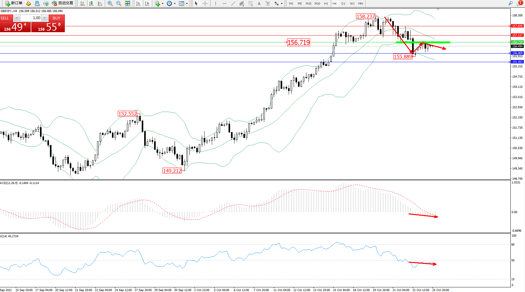技术点评:高位空头动力维持在布林带指标通道中下轨区间持续震荡下行,低位抵达155.889附近得到短暂支撑反转上移,但高位空头下行趋势态势良好,短期多头动力未见强势入场态势,布林带指标呈缓慢张口走势后有开始收口下行,MACD指标处于0轴线下方空头区域维持窄幅整理平移,RSI指标处于50均衡线下侧弱势徘徊中;