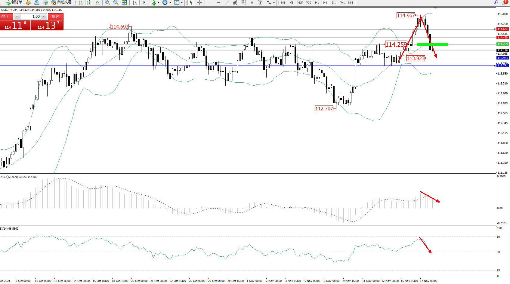 技术点评:多头动力延续布林带指标上轨附近节点持续震荡上扬,高位抵达114.967位置后遇阻开始急速回撤,跌破布林带指标中轨进入中下轨区间整理,短期空头动力有继续回撤下行走势迹象,布林带指标呈张口走势后开始有收口迹象,MACD指标处于多头区域维持了缓慢下行,RSI指标处于多头区域持续震荡下行至50均衡线下侧徘徊;