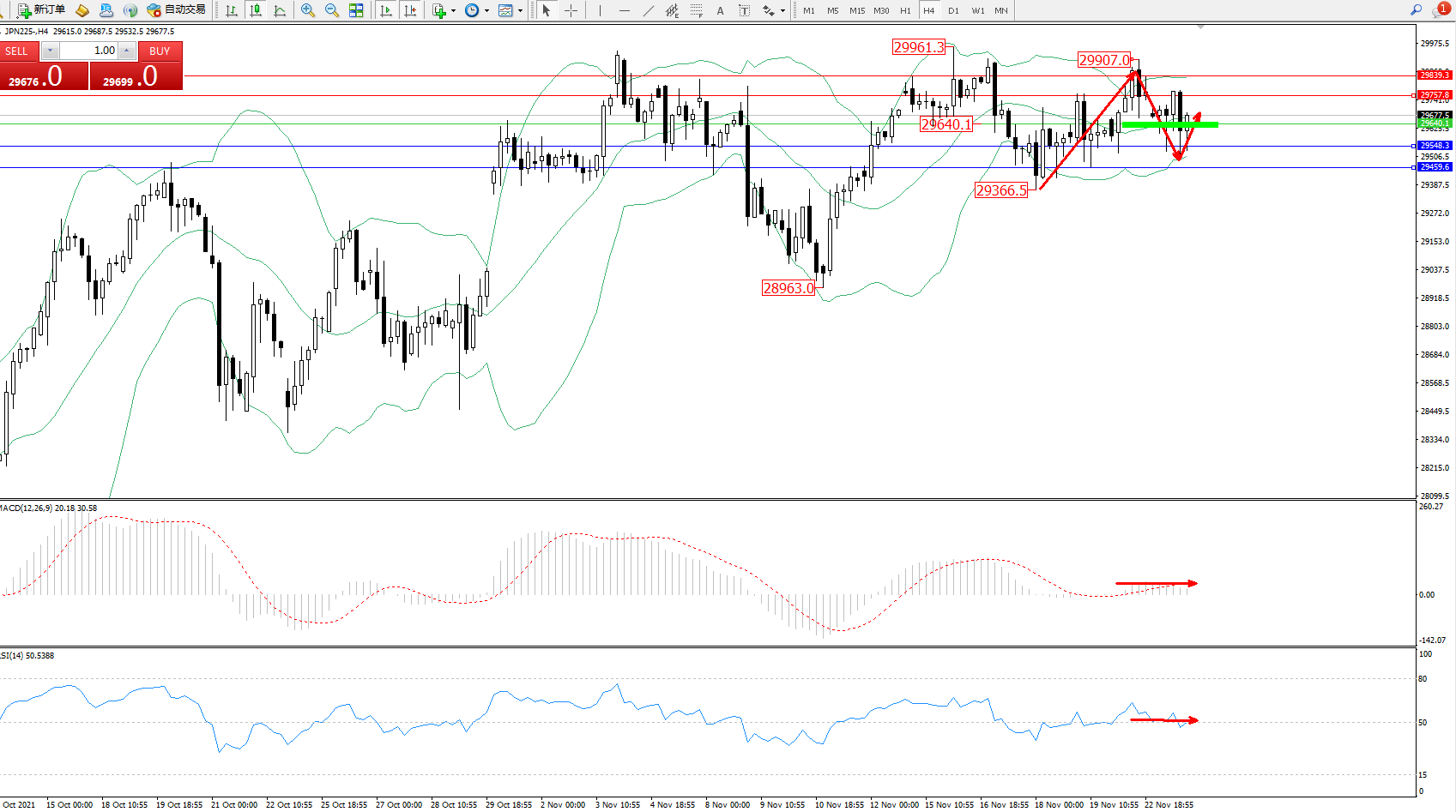 日经指数JPN225——4小时K线图显示: