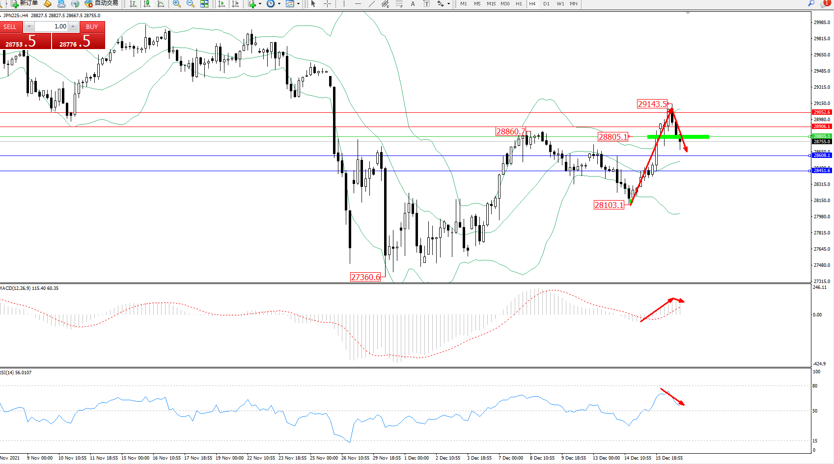 技术点评:低位多头动力延续布林带指标上轨附近持续震荡上扬至29143位置后遇阻回撤,短期多头动力高位压制存在,空头动力伺机入场,急速下挫,布林带指标呈张口走势持续后有短暂收口迹象,MACD指标多头区域维持整理平移,RSI指标处于多头区域拉升后出现反转下行走势;
